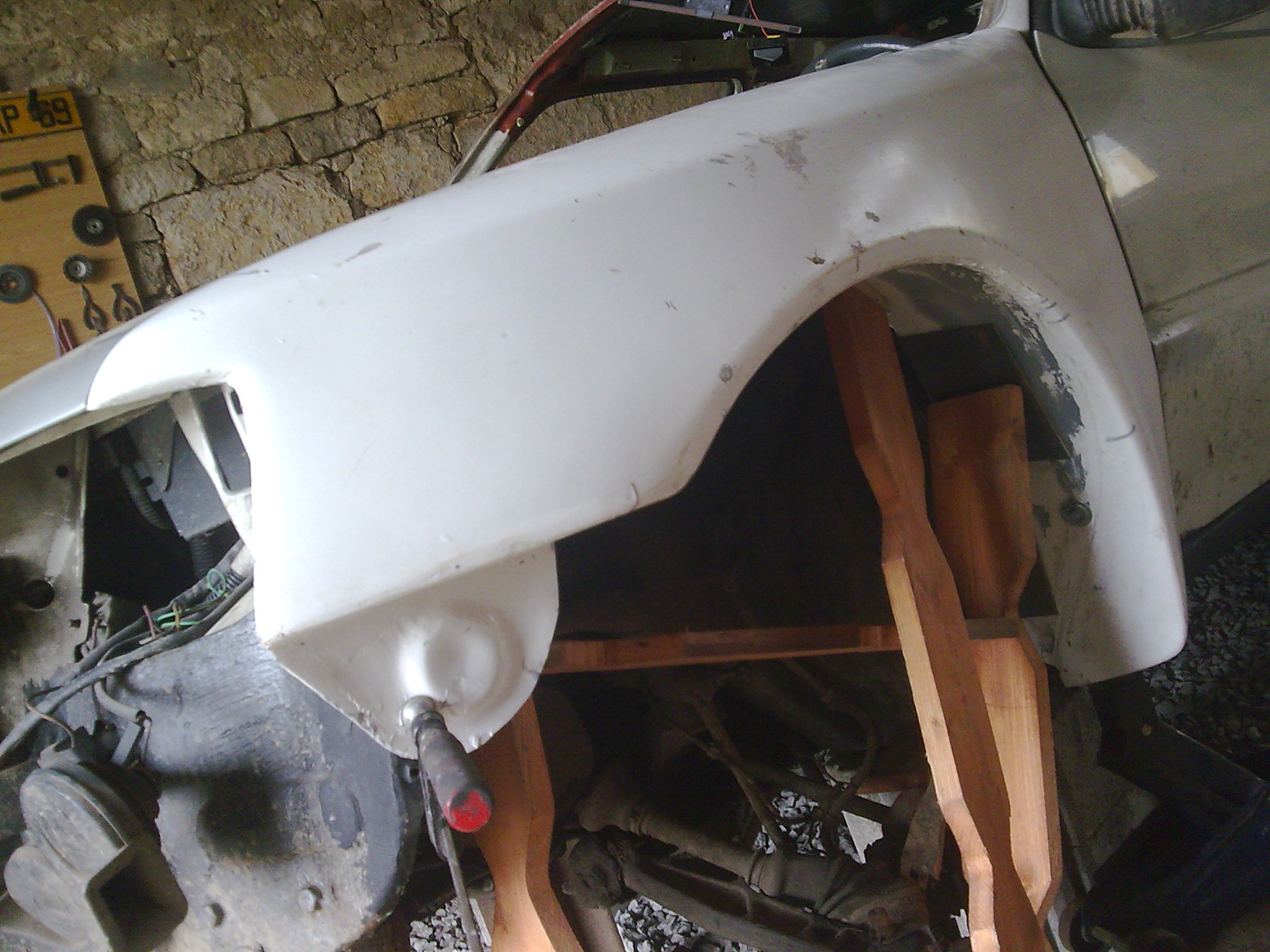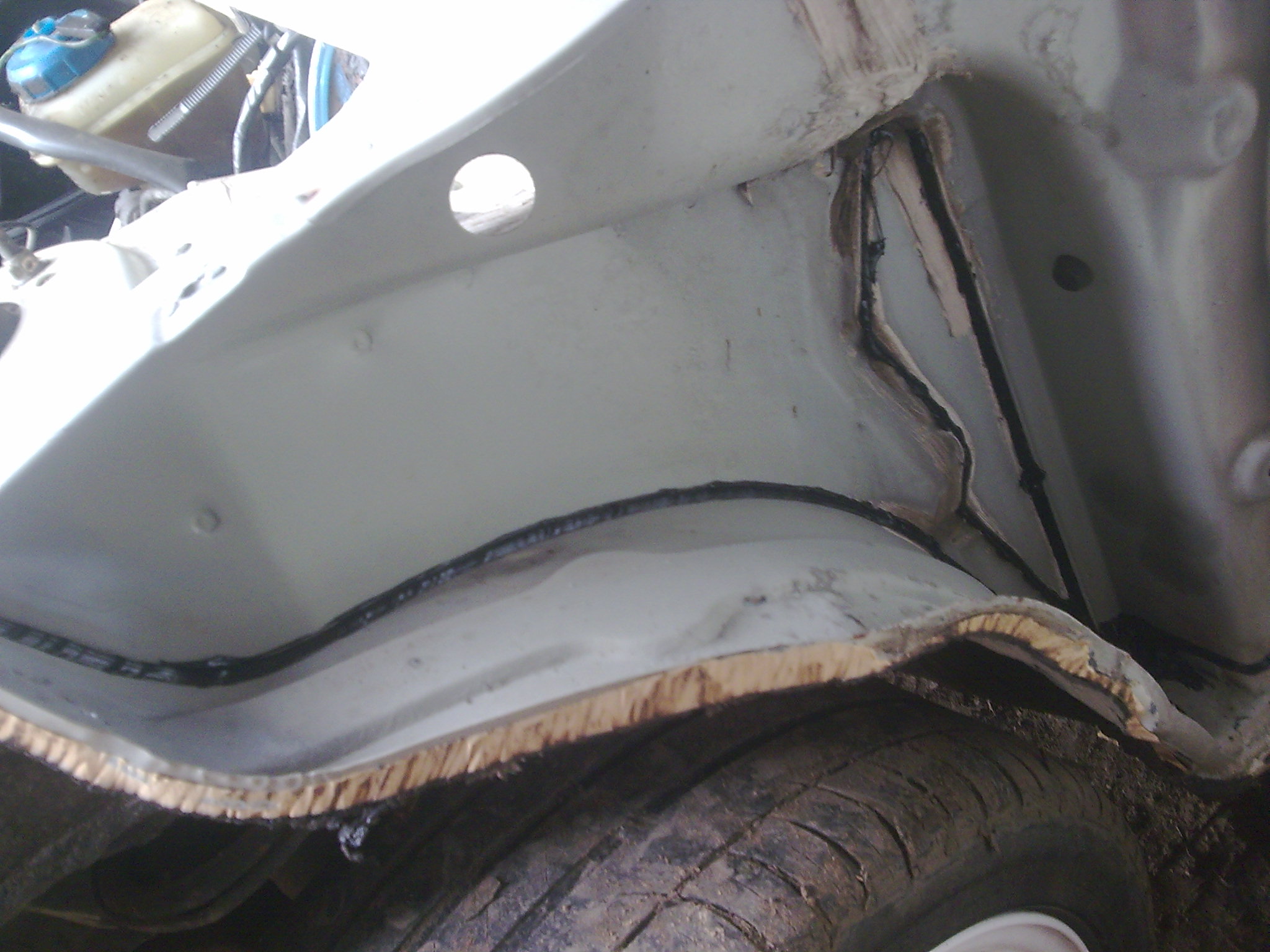 Začal jsem přednímy blatníky, prvně jsem musel udělat podběhy, protože fuka mezi podběhem a blatníkem byla někde i 5cm, tak jsem to udělal z pružnýho plastu a luxusně to pasuje. Po napasování na kastli následovalo lepení a tmelení. Lepení jsem si vybral kvůli tomu že se mi nechtělo vrtat do kastle což, i když se pořádně ochrání kastle tak stejně zásah do kastle časem dá na sobě vědět. Lepil jsem to kvalitním lapidlem Sikaflex a taky, že na přední blatníky padlo i s tmelením 4Kg