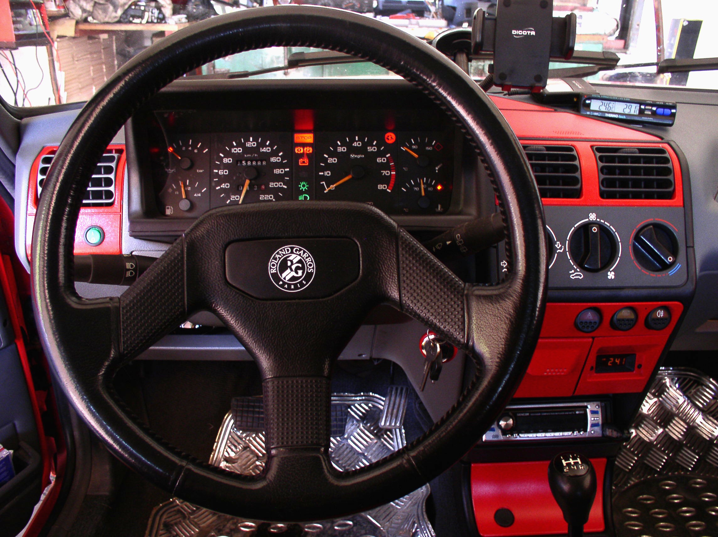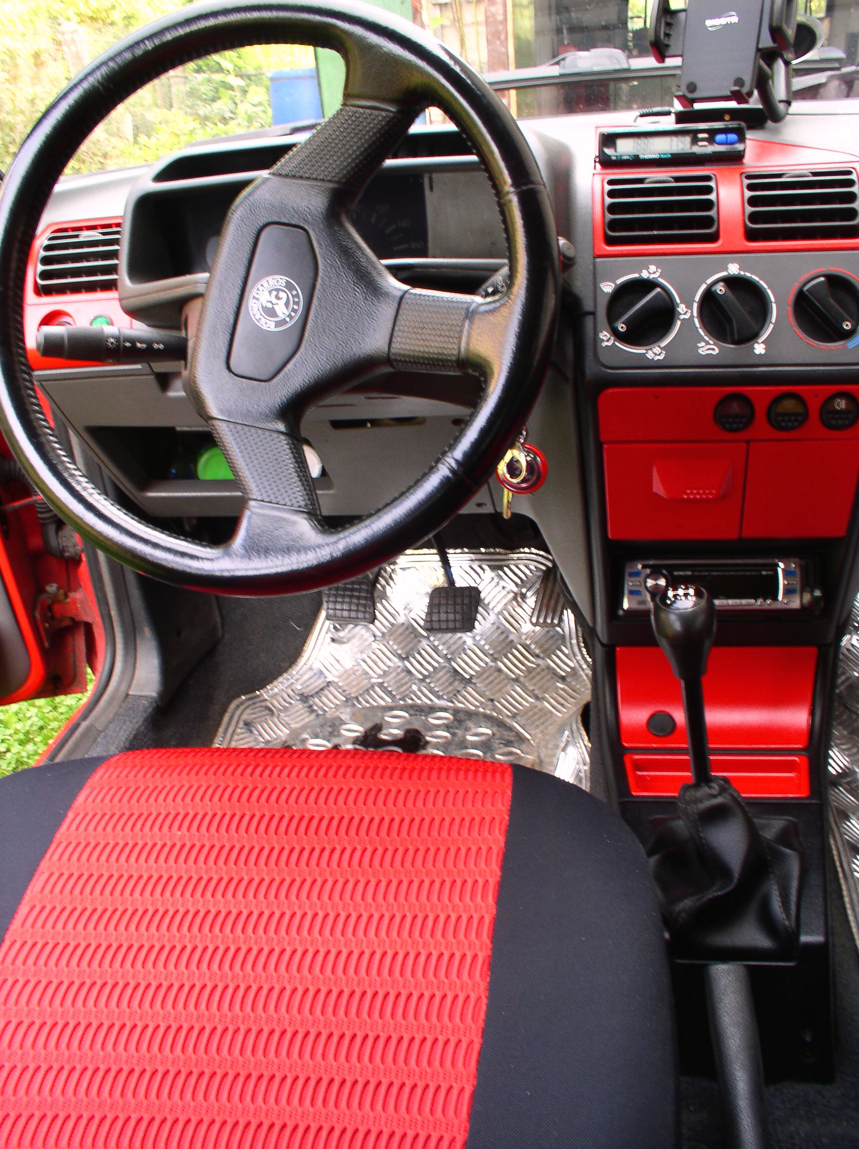 Volant, palubka, kaplicka + stredovy panel + stredova konzola na tunel, skupinovky(priprava na operaci prozatim "jen" zatmaveny viz vyse), spojler (na to, ze plast je temer gumovy jsem se celkem divil, ze je rozlamany, tedy byl. Po opravdu heroickem vykonu je jiz svareny)<-- mel byt orig z RG.