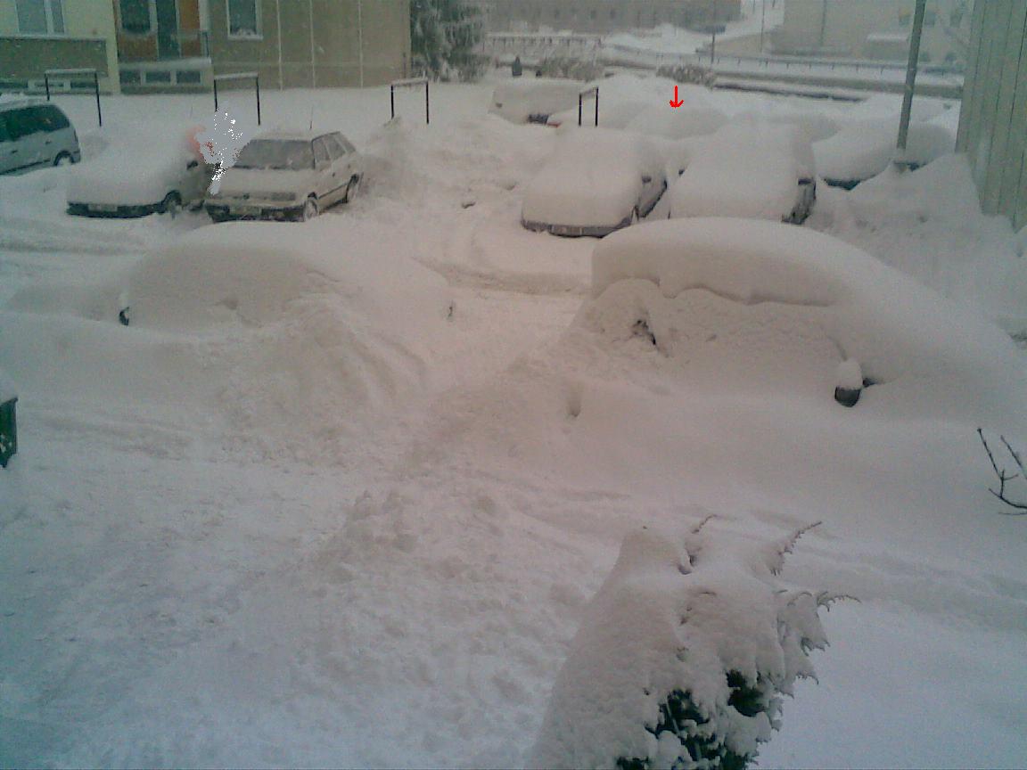 Tak na dnešek napadlo dalších 20-30čísel...Jak je ta šipka to je můj Peugeot, večer s ním přijela manželka z práce....:-( Už se tu nedá chodit natož jezdit...město trochu zaspalo....
