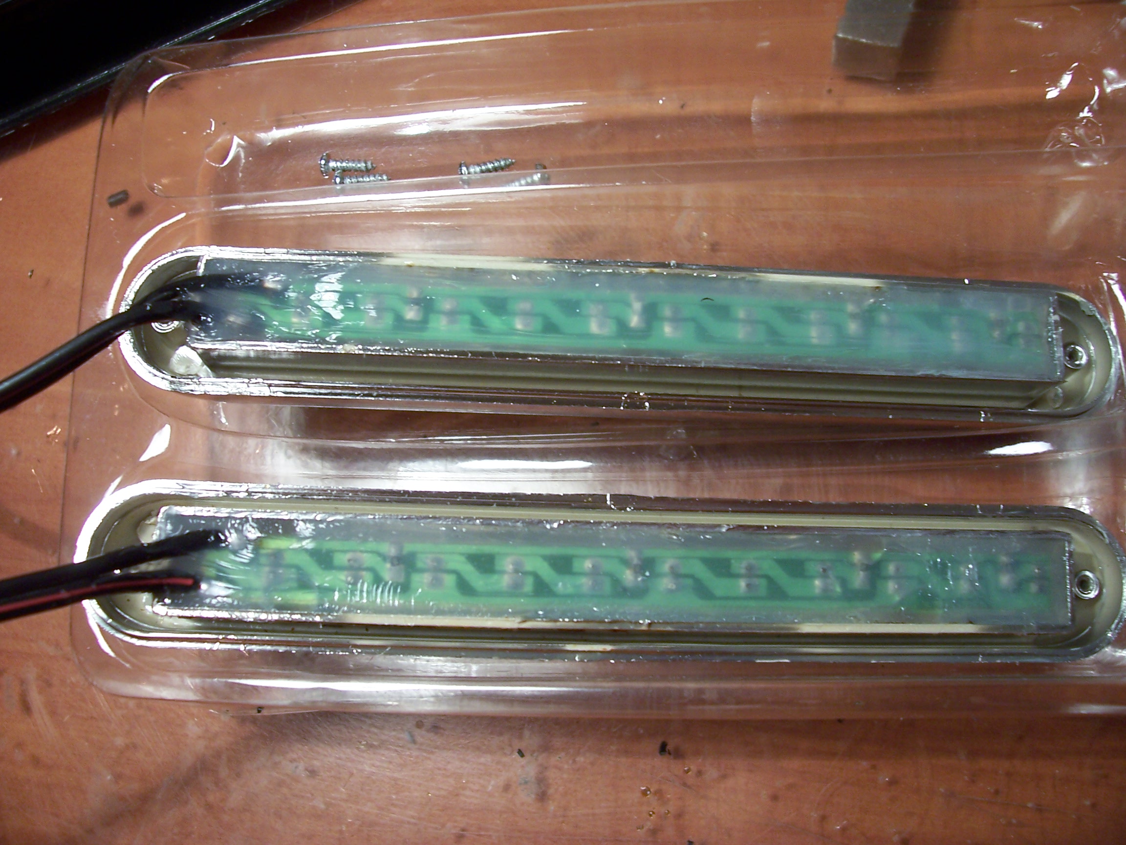 Dneska uz konečně otevřeli obchod s elektronikou tak jsem nakoupil potřebné v vrhnul jsem se na upravu denního svícení tak aby se dalo použít v exteriéru. Z výroby to totiž bylo naprosto nezabezpečené proti vniknutí vody a napájecí drátky taky nevypadali moc provozuschopně. Takže namisto puvodních dratků jsem použil napájeci dvoulinku pro exteriérové použití, vodotěsné konektory (stejné mám na mlhovkách a jsem s nima nadmíru spokojen) a zadní část tištěného spoje jsem zabezpečil silikonem. Počkám do zítřka až silikon zavadne, zkompletuju, udělám přípravu na autě a jak bude trochu rozumný počasí tak to připojím. :)