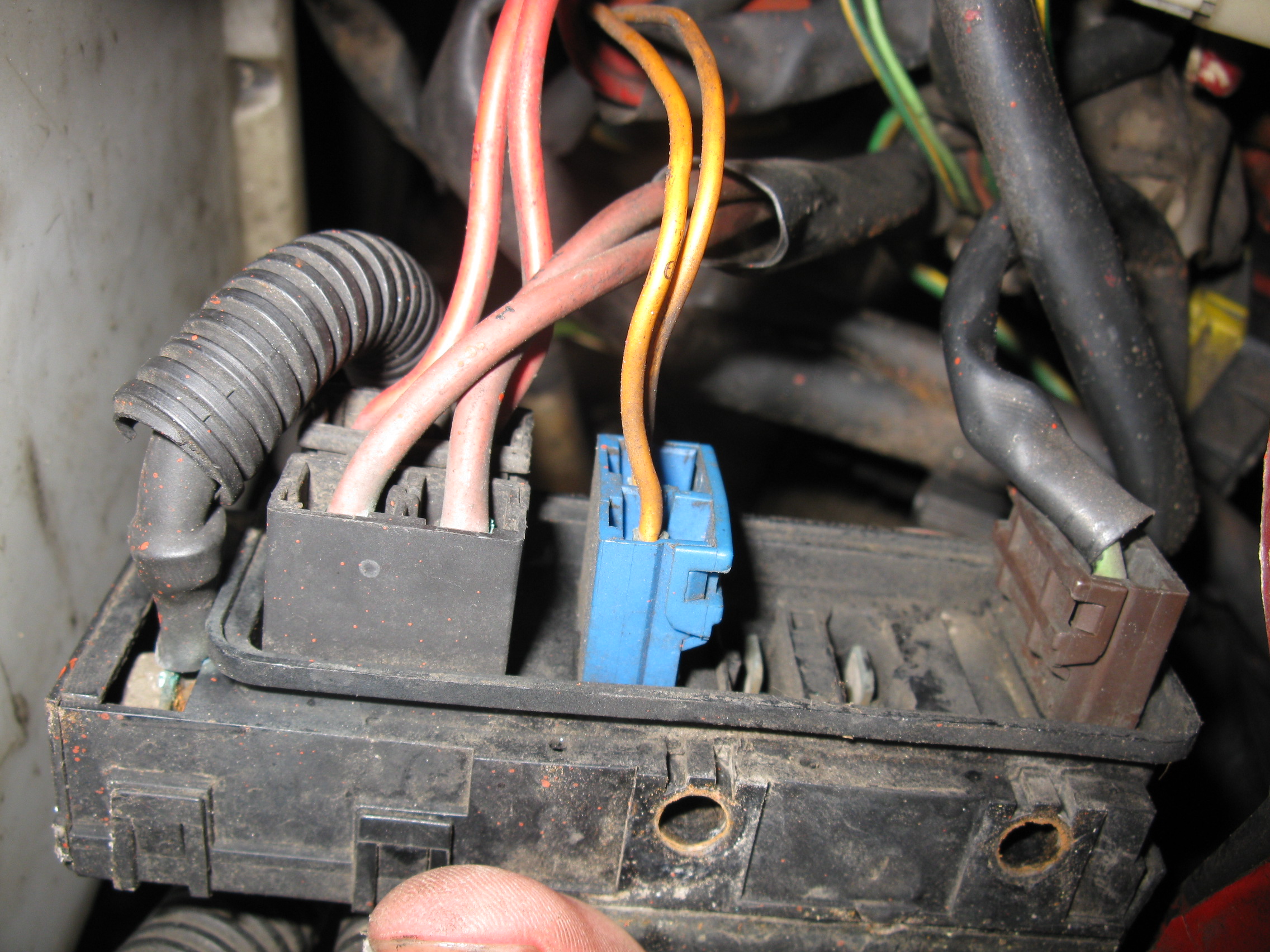 Tak tu krabicku poctive vycisti, zkontroluj jestli se nejaka pojistka nepretavila a pak hlavne vycisti to třípinové čidlo na chladiči (kdyz se divas zezadu na chladic, tak je v rohu chladice, ktery je nejblize levemu prednimu svetlu), staci tam odpojit ten konektor a pořádně ty kontakty mechanicky očistit (bacha, kdyz je spojis tak ti to pěkně zajiskří => sepnuti sahary).
