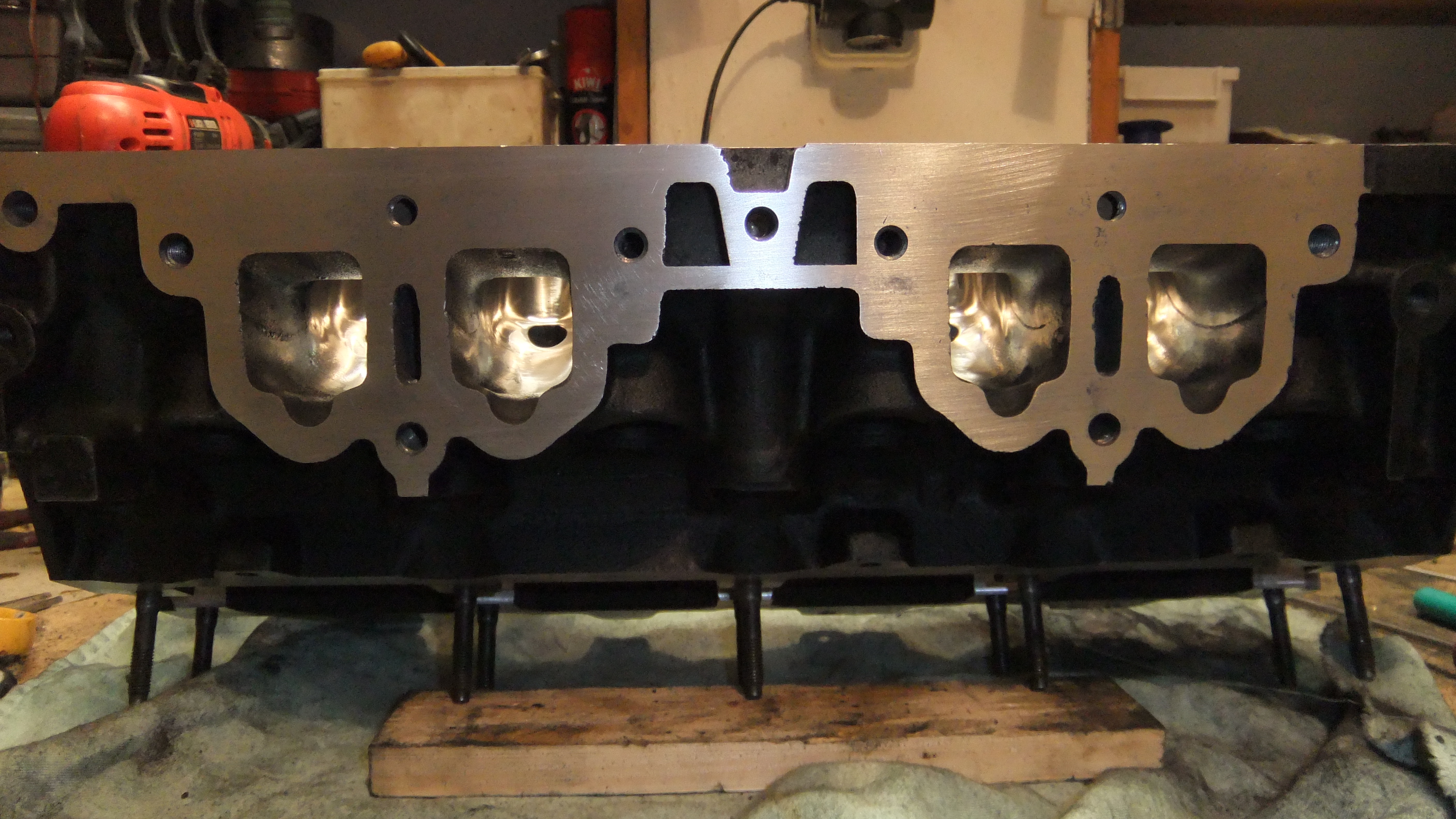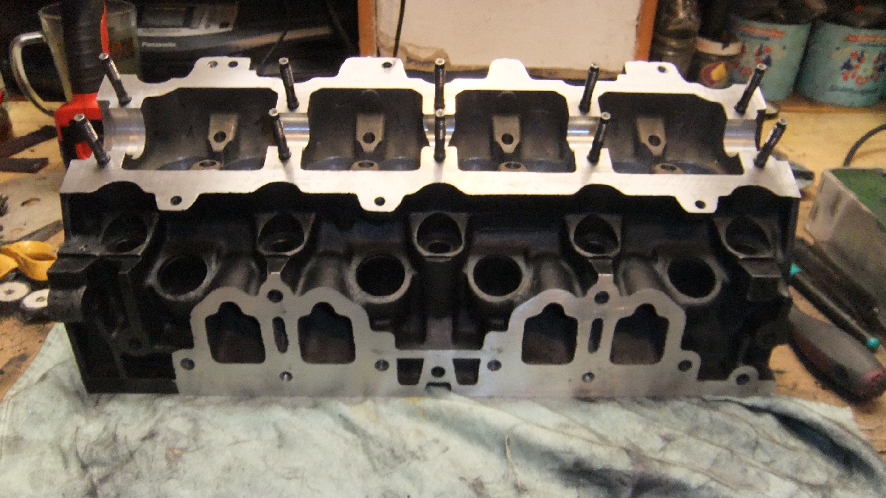 jak sem rekl, tak se stalo - kompletne upravena hlava z 88kW pro sparovani s karburatory, uprava sacich kanalu, ocista, zalapovani, nove gufera samozrejmosti, a novy nater taktez :fran: