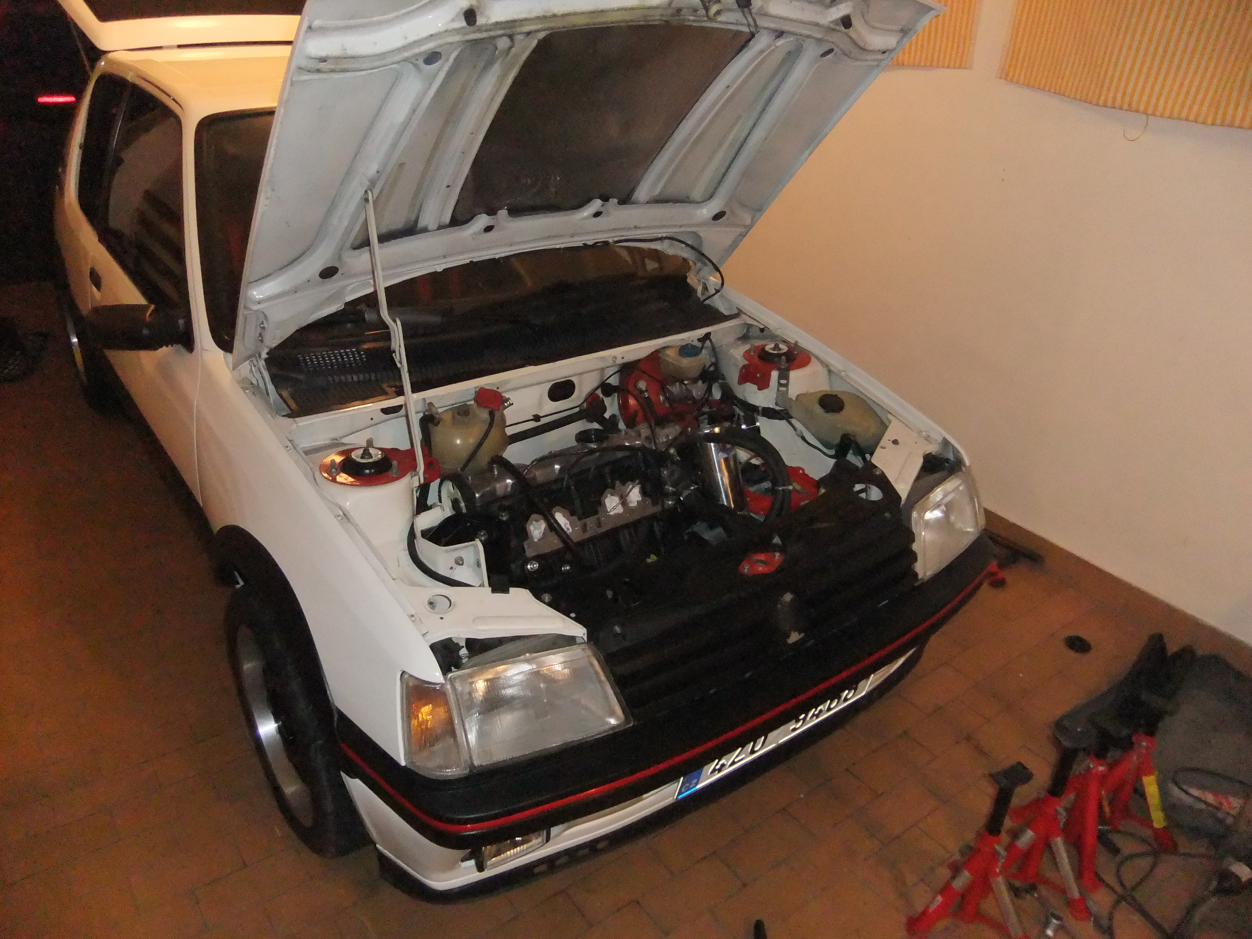 a zaverecna momentka, ramena 309GTI s polyuretanovyma silentblokama, stavitelne tlumice Kayaba AGX, odlehceny 1,6kovy setrvak, pod uterku sa skryvaju nove karbecy, samozrejme po ociste a "rozborce sborce", chybi uz enom sani a nejaka silena vacka... ;)