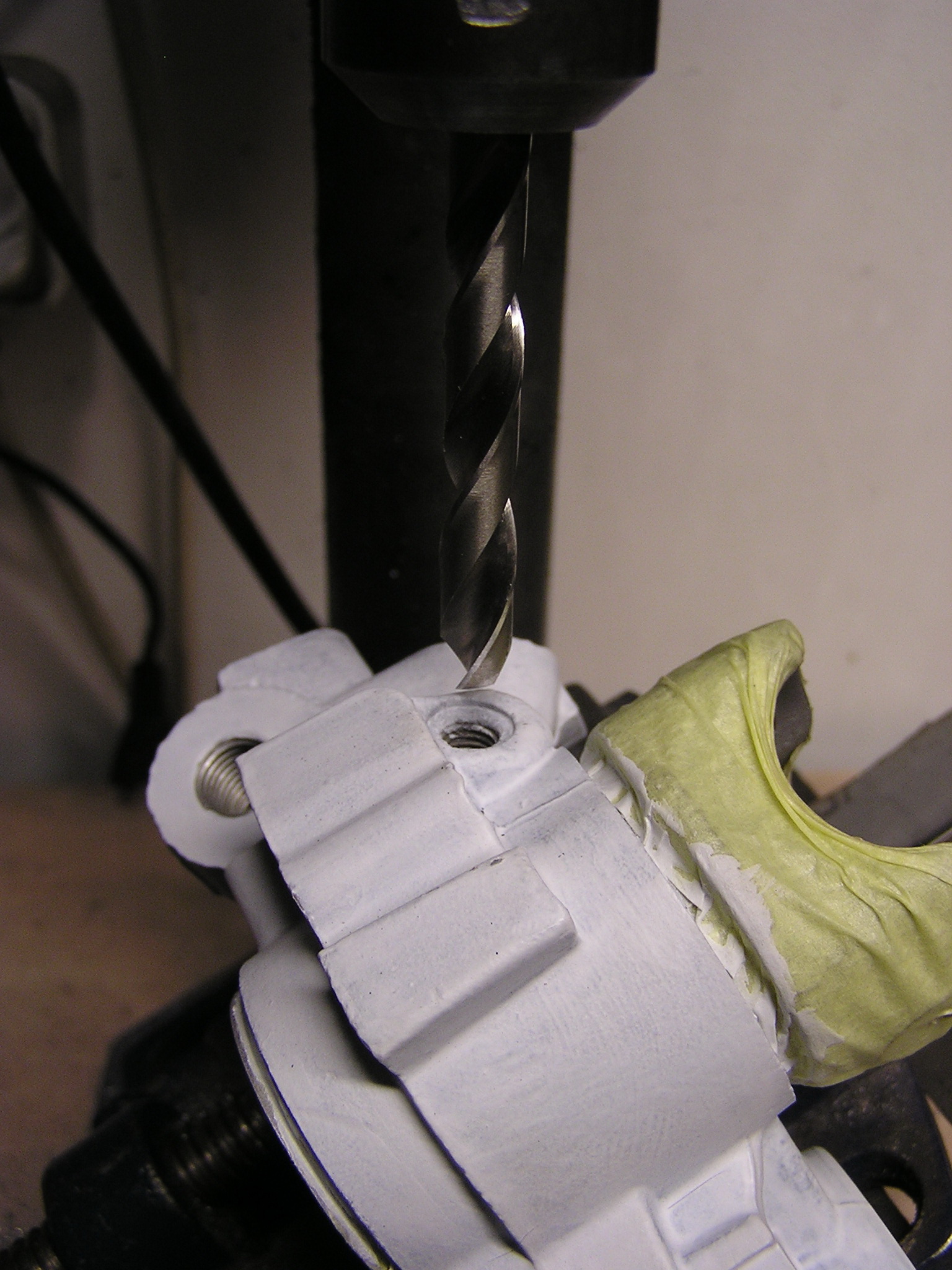 Po opískování třmenů jsme zabránili oxidaci první vrstvou epoxidové základovky (dočasně, než se budou stříkat vrchním epoxidovým lakem) A po ošetření barvou přišla na řadu oprava dosedacích ploch a stržených závitů pro odvzdušňováky. Na tuhle akci jsme použili sadu Helicoil.
