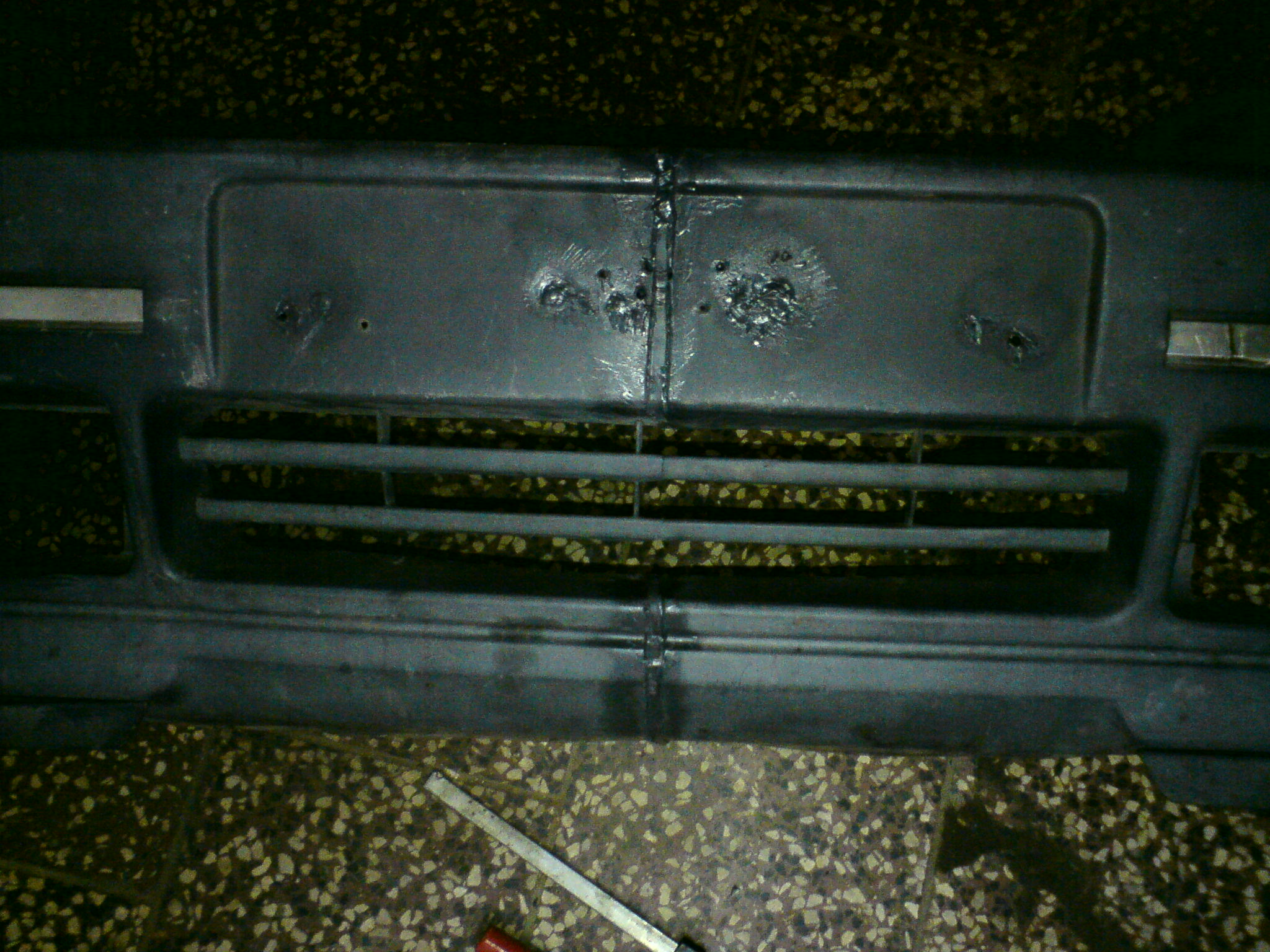 Nárazník mám upravený na správnou velikost a svařený. Je to zatím jenom na hrubo. Díra na pravé straně u tažného oka, už je taky zavařená.