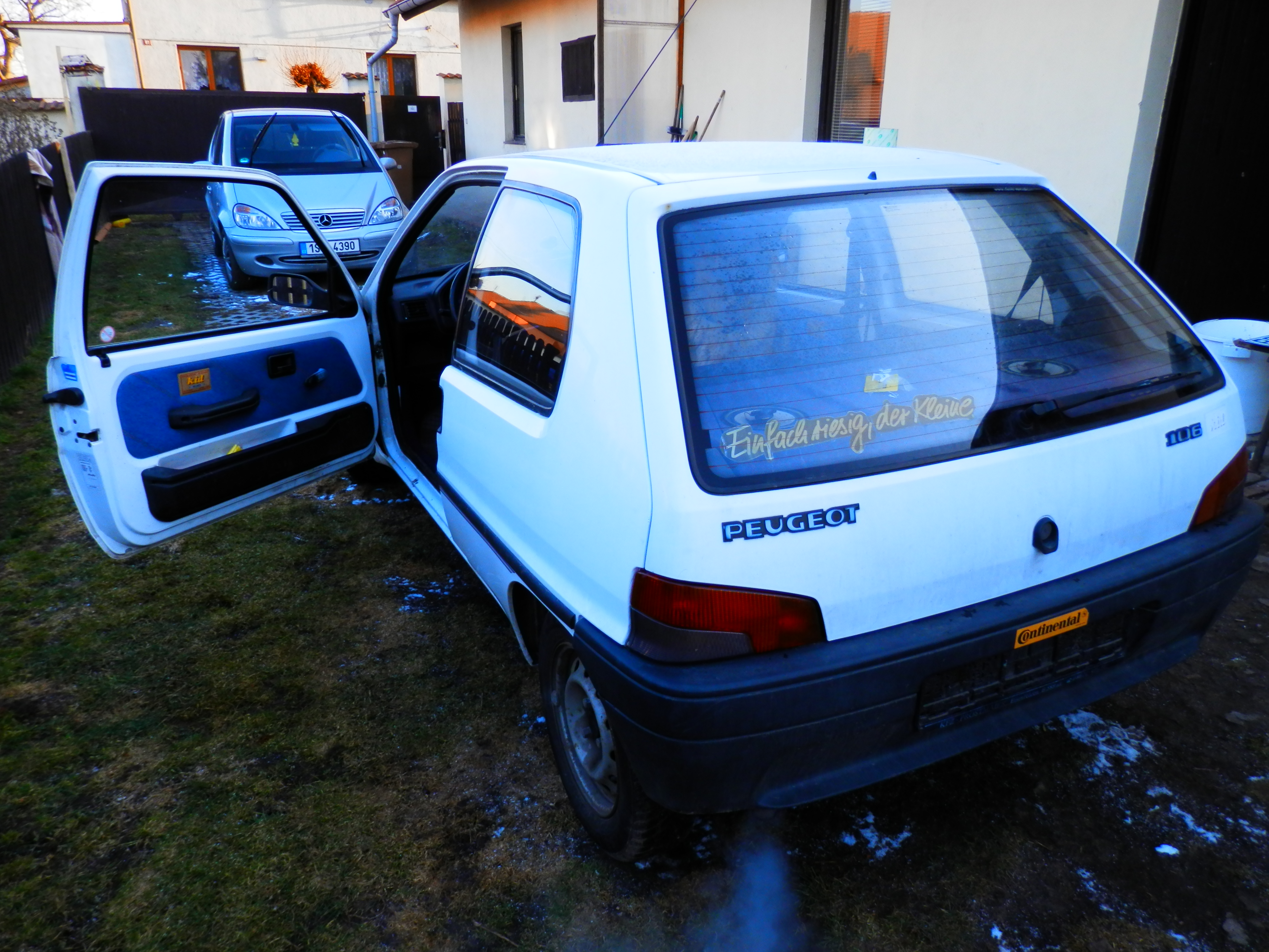 Důvod zrušení papírů bylo zakoupení jinýho auta- tuhle káru dostala čuba místo boudy :-) Tak že kromě tadní sedačky na který v autě spí, je na prodej úplně všechno. Na autě jsou nedávno dělaný komplet brzdy, čepy(Lemförder) v předních ramenech jsou taky někdy od podzima, je tam jedno nový přední světlo, dvě sady kol-Zima(Maxxis)/léto(Barum) jestli je na každý sadě najeto 1000km, tak je to hodně-obě sady jsou na plech. diskách-3 díra. + jsou tady ještě dvě obutý rezervy-taky plechy.