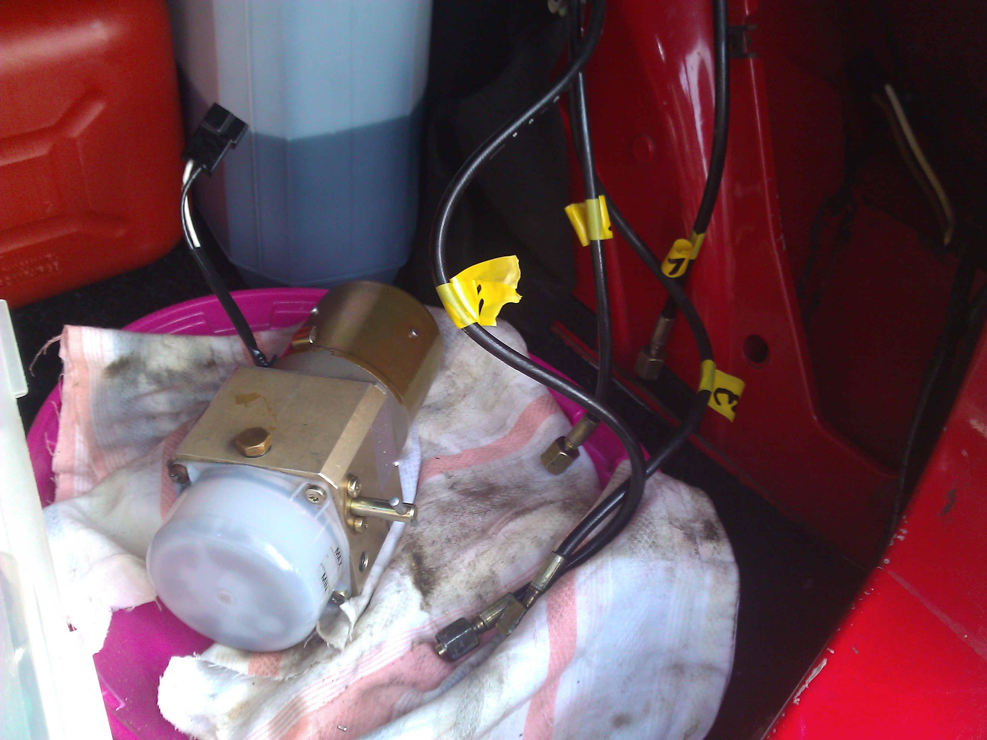 Po vymontování jsem objevil ten únik oleje - dvě kolena už netesnila a byly docela solidně zarezlé. Všechno jsem teda vymontoval, servo očistil benzínem a vylel hydraulický olej. V týdnu se stavím někde do obchodu s hydraulikou a seženu ty nové kolena a asi i koncovky hadic, když už jsem se do toho pustil. Taky jsem musel rozebrat střední tunel a připojit konektor k tlačítku ovládání střechy.