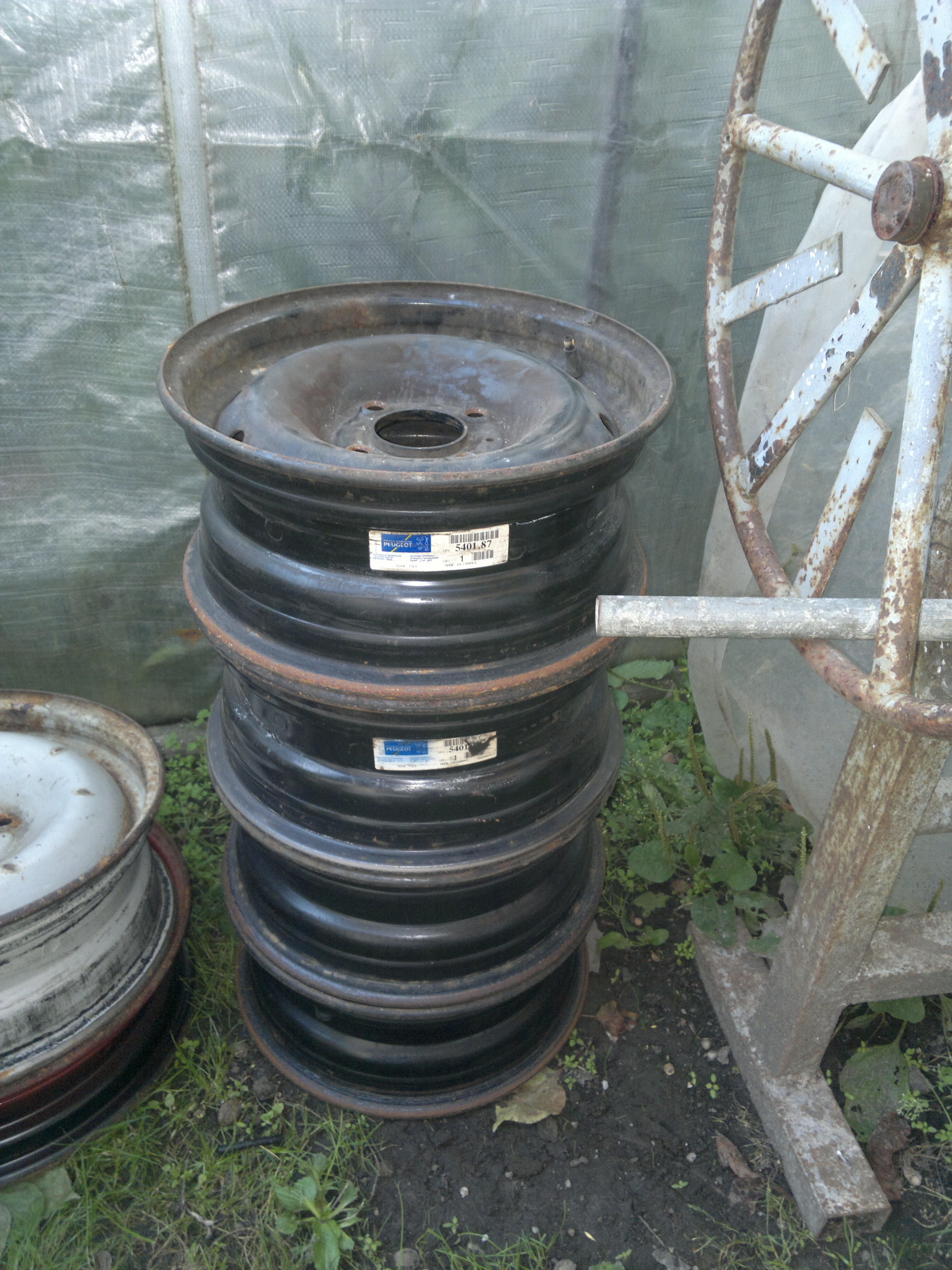 Mám tu navíc plechový disky. Rozměry 4x108, ET20, 13". Je to ten typ, co se vleze na chlazený girlingy. chtěly by novej kabát, ale není to nic hroznýho. Všechny 4 jsou origo peugeot