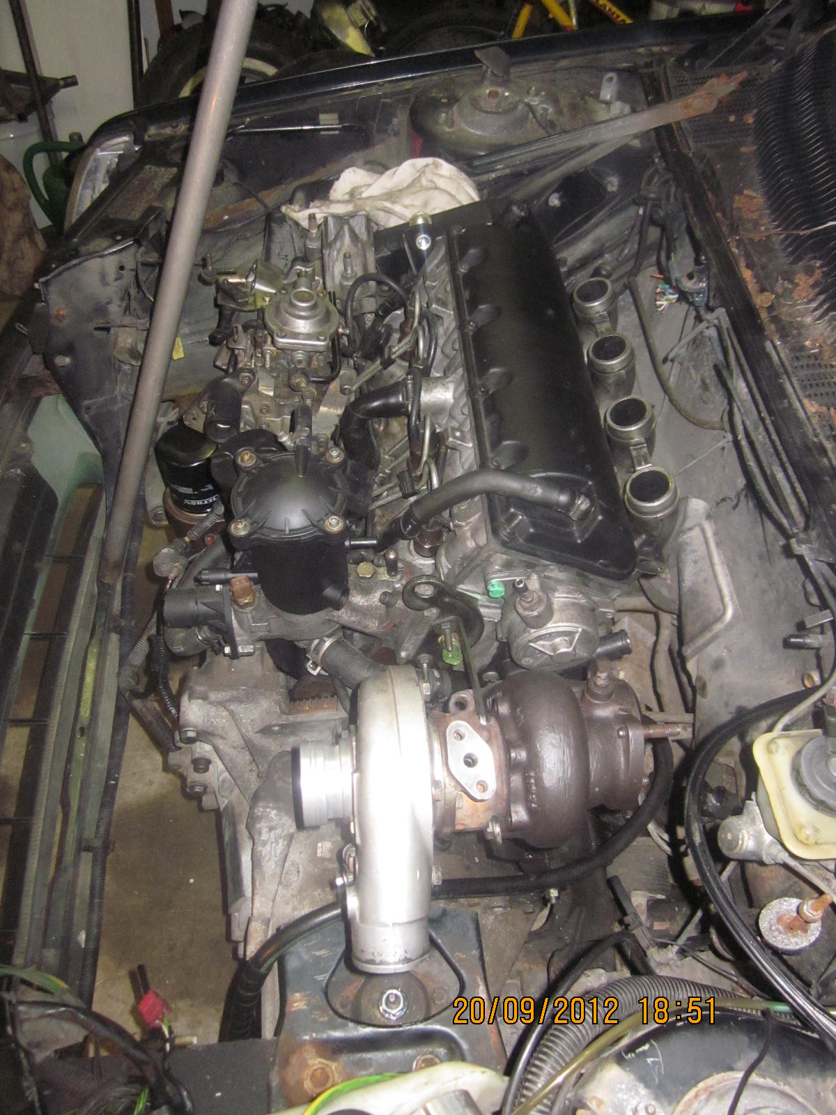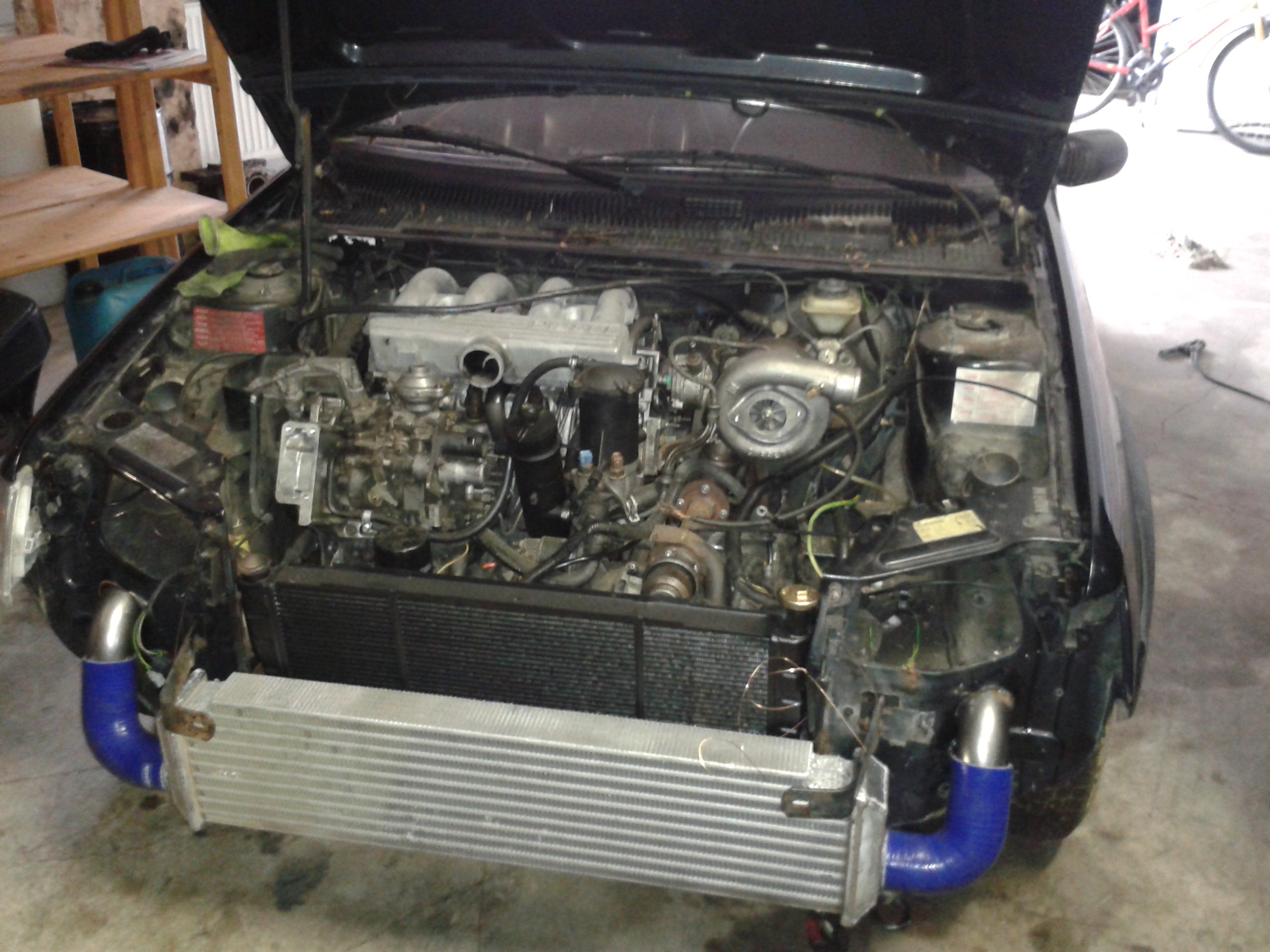 Tak motor konečně v autě, Turbo na svém místě :-) Svody a vejfuk napůl hotovy (časem dohodim fotky) ještě dodělat regulaci turba a motor snad bude komplet