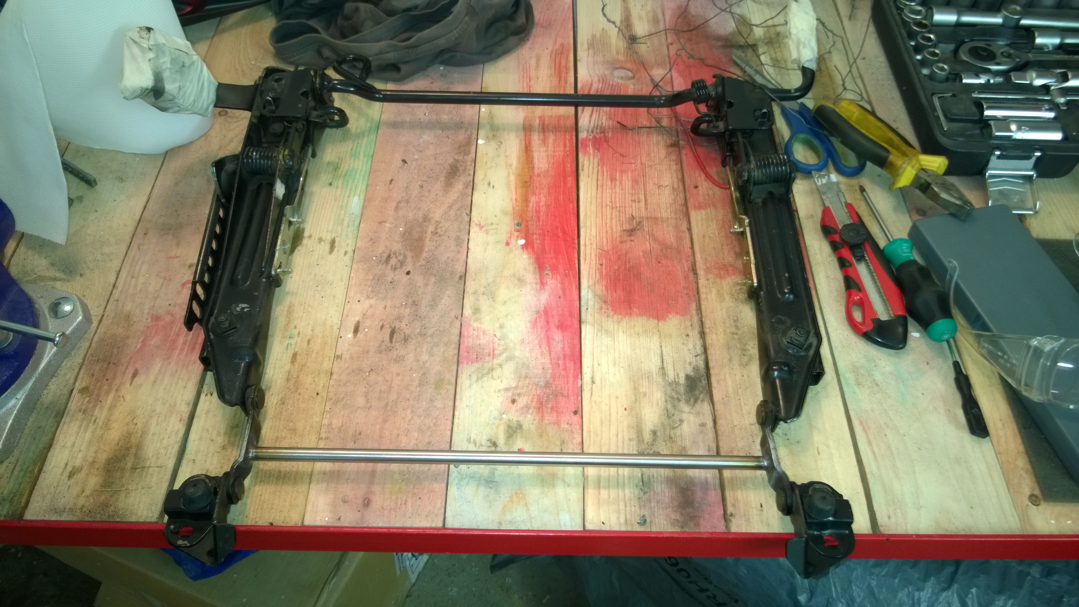 Včera proběhlo druhé kolo opravy spolujezdcovy sedačky. První oprava (pouze opětovné přivaření) vydržela necelý rok. Sklápěcí mechanismus Francouzi dost podcenili, takže tu trubičku o tlouštce asi milimetr nahradila 10mm nerezová kulatina. Tohle už vydrží všechno