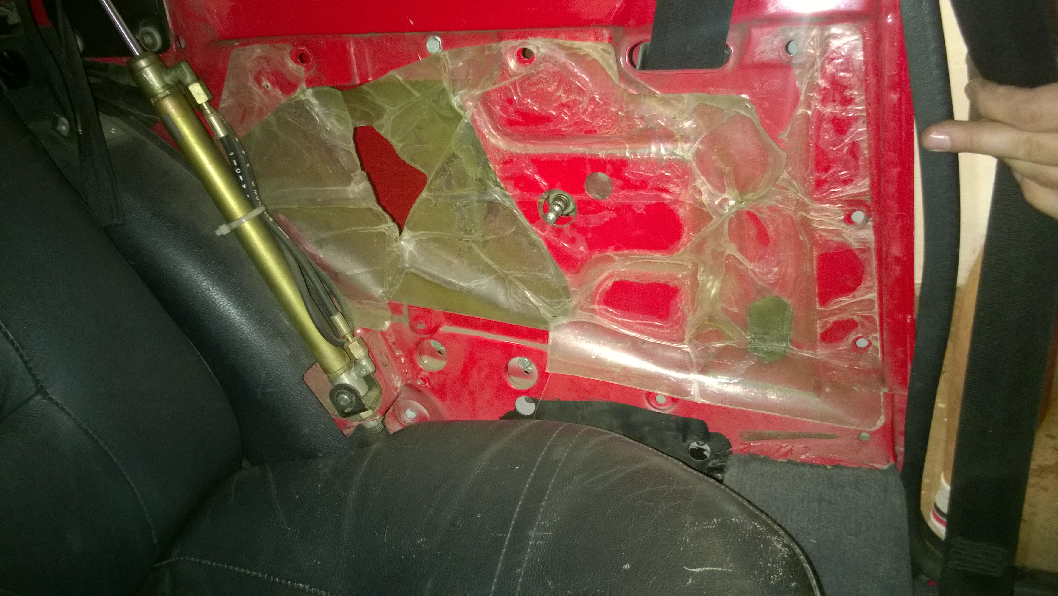 To není tlumení, ale pouze igelit, aby Ti neshnil tapecírunk. A případná voda, která se tam vysráží nebo nateče z okna, tak aby stekla do blatníku, kde přes práh odteče ven...