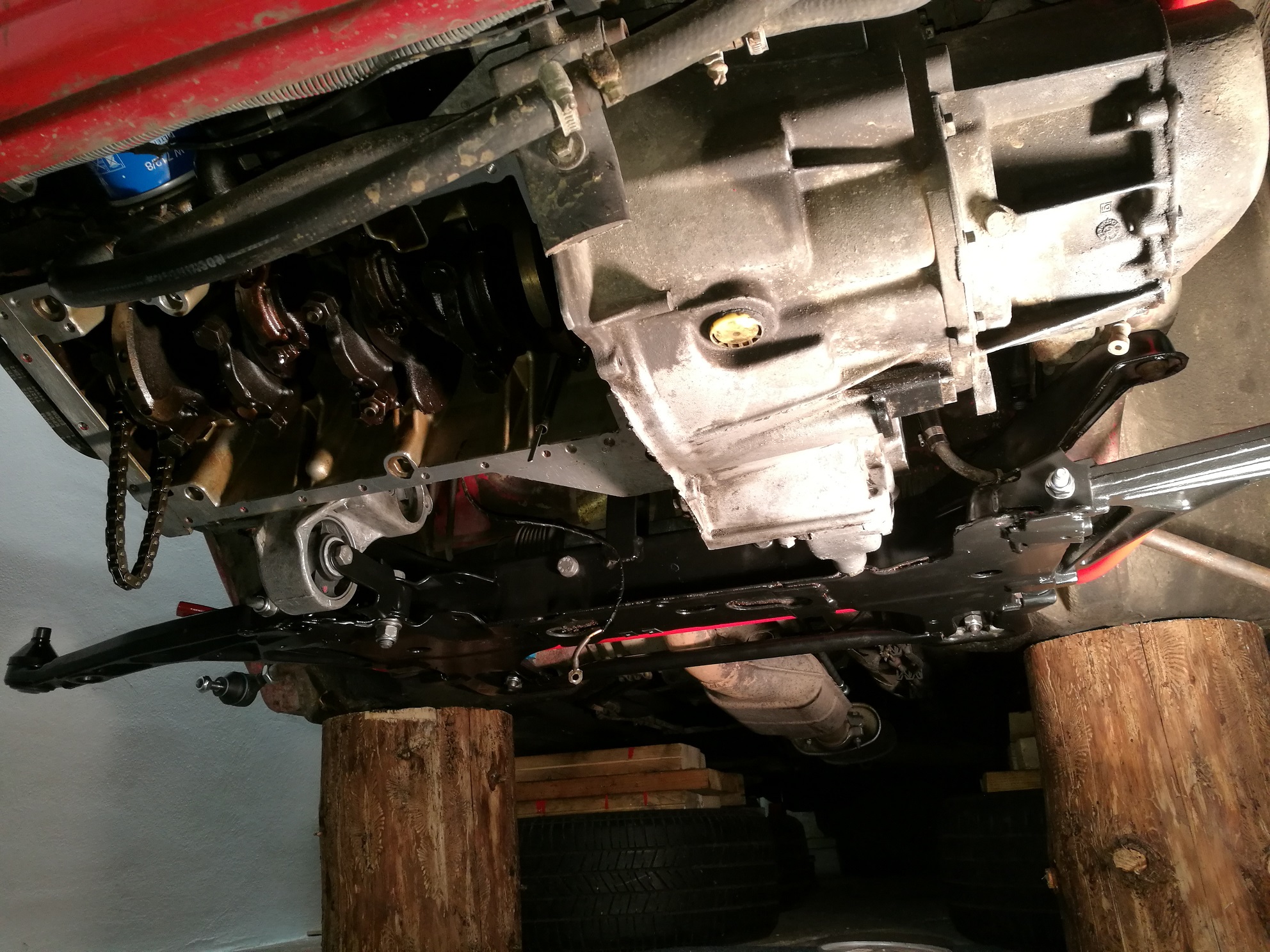 Takže tento víkend namontováno zpět olejové čerpadlo, nasazena olejová vana s novým těsněním, nasazeny poloosy, naplněn motorový olej, uchycen plechový kryt výfuku, namontován zpět airbox a váha vzduchu. Opískované těhlice jsem natřel bezbarvým lakem a v místním autoservise mi ně nalisovali nová SKF ložiska.