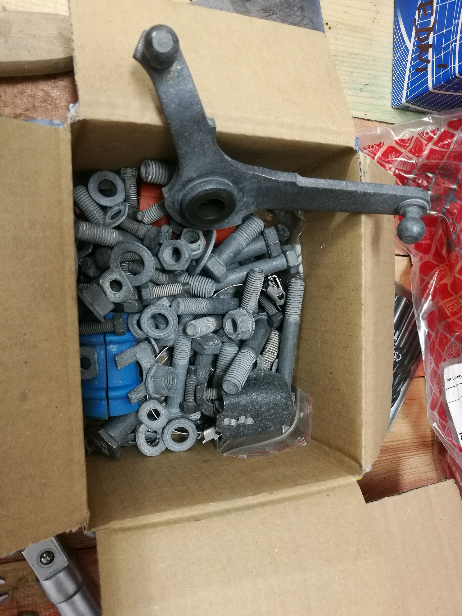 Takže tento víkend namontováno zpět olejové čerpadlo, nasazena olejová vana s novým těsněním, nasazeny poloosy, naplněn motorový olej, uchycen plechový kryt výfuku, namontován zpět airbox a váha vzduchu. Opískované těhlice jsem natřel bezbarvým lakem a v místním autoservise mi ně nalisovali nová SKF ložiska.