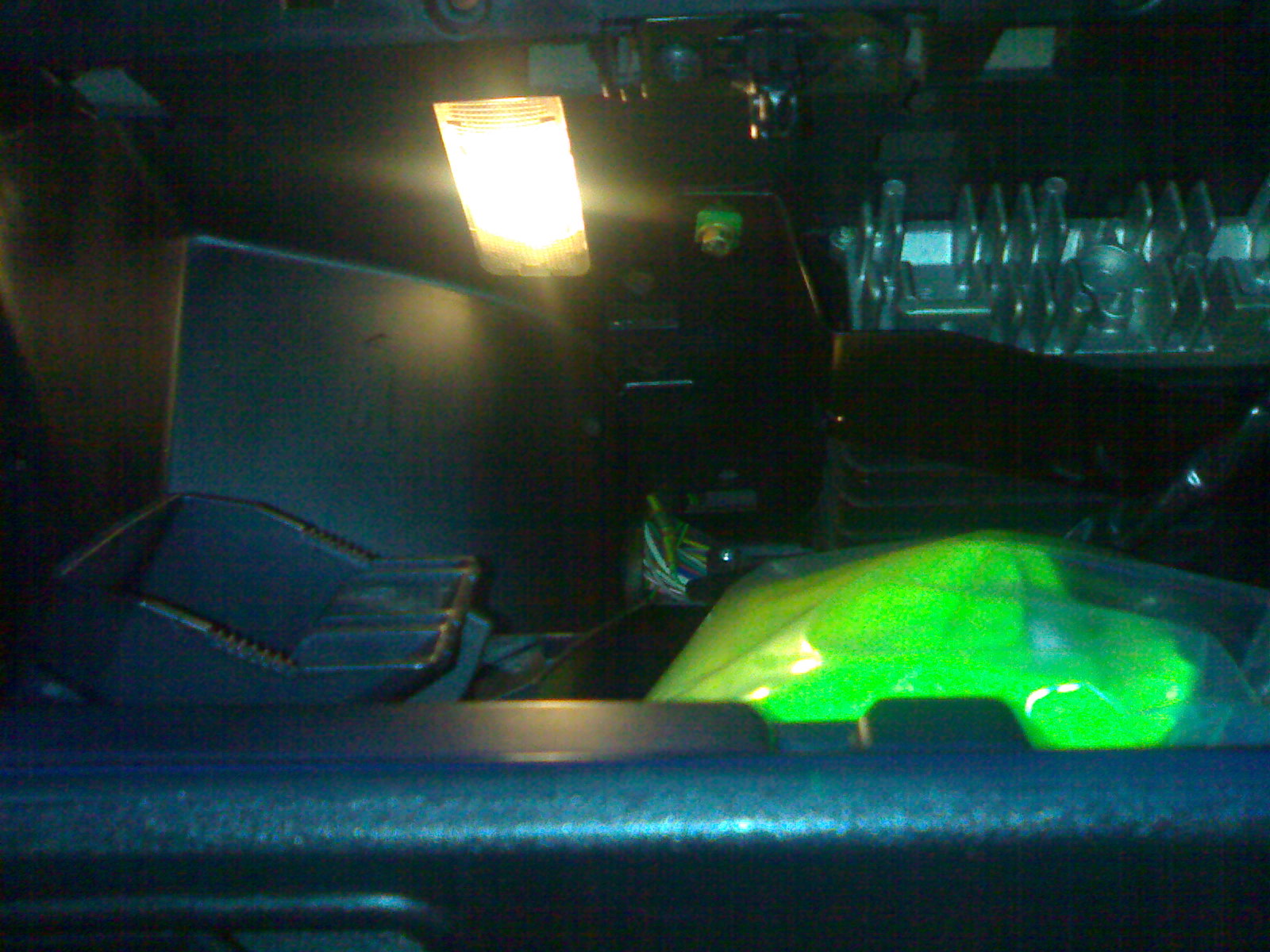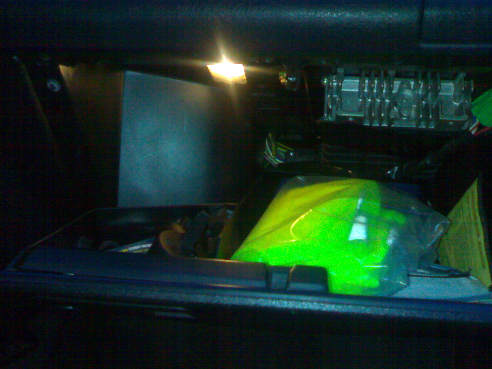 Nedávno jsem úspěšně zapojil osvětlení spolujezdcovy přihrády, které svítí již při zapnutém zapalování. I přesto že jsem použil originál z Indiany klidně můžete použít z jakéhokoli modelu třeba osvětlení kufru ;-) ... A drátky jsem zapojil takto ... + je na fotce vidět hned za spínačkou ten kousek žlutého konektoru a - je hnědý konektor hned nad tím žlutým uchycen v palubovce :urg: ...
