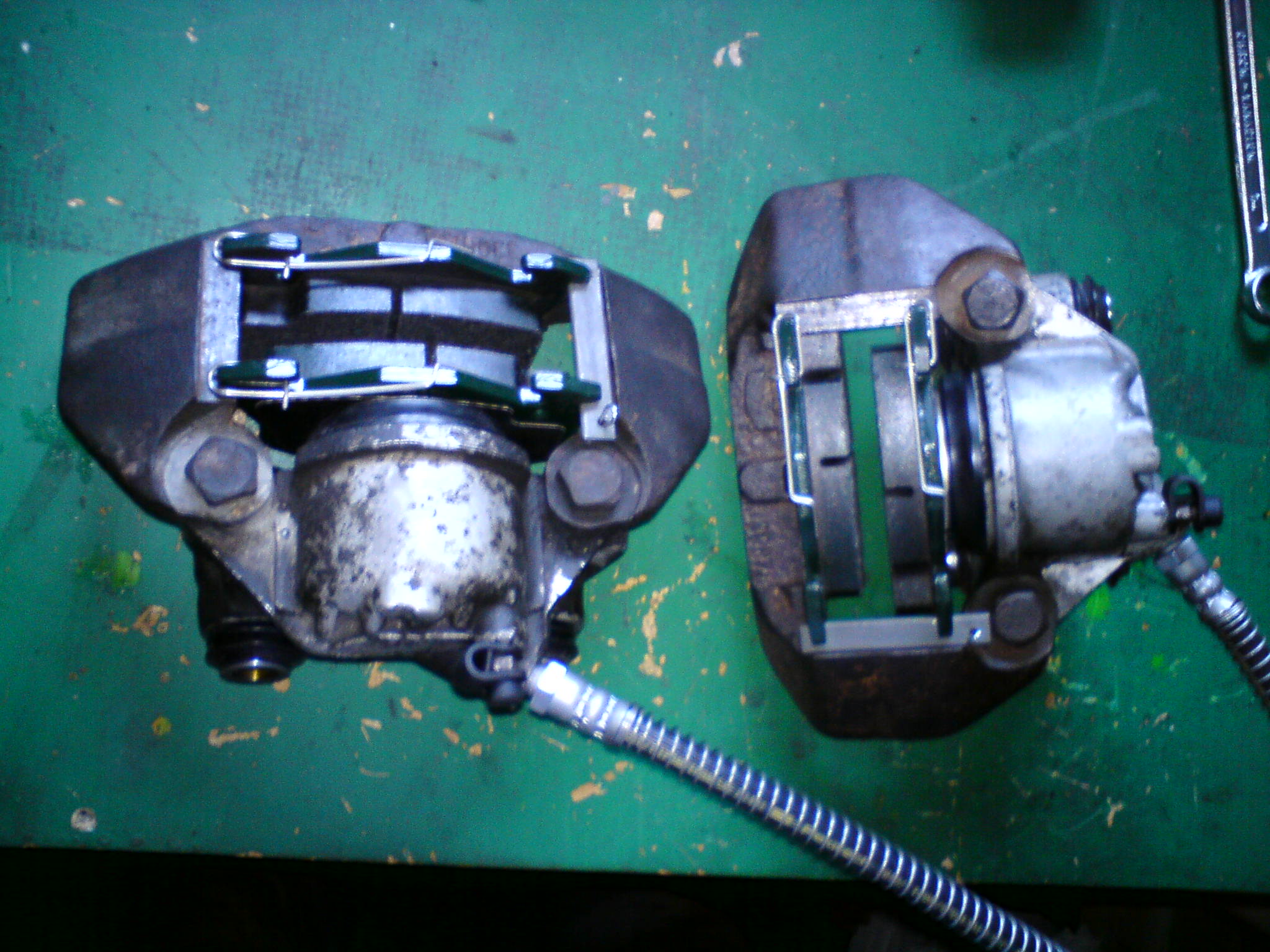 Tak brzdy už mě natolik zlobily, že jsem se rozhodnul udělat kompletní generálku už teď, před odjezdem do školy do Brna. A bylo to správné rozhodnutí, protože po sundání třmenů opravdu nebyly v dobrém stavu. Takže jsem dal komplet nové trubičky a hadičky k předním brzdám, komplet jsem zrepasoval zakoupené třmeny a vyměnil jsem i brzdové čelisti. Ještě jsem se smůlou zalomil jeden zadní odvzdušňovák, takže je i nové prasátko. Vše jsem dával kvalitní, aby to dlouho vydrželo a dělalo dobrou službu. No vyhrál jsem si s tím vším pěkně, ale výsledek ja parádní! Vše je odvzdušněno a brzdí to krásně jako nikdy předtím, takže spokojenost :up:. A teď pár fotek jak to vypadá:
