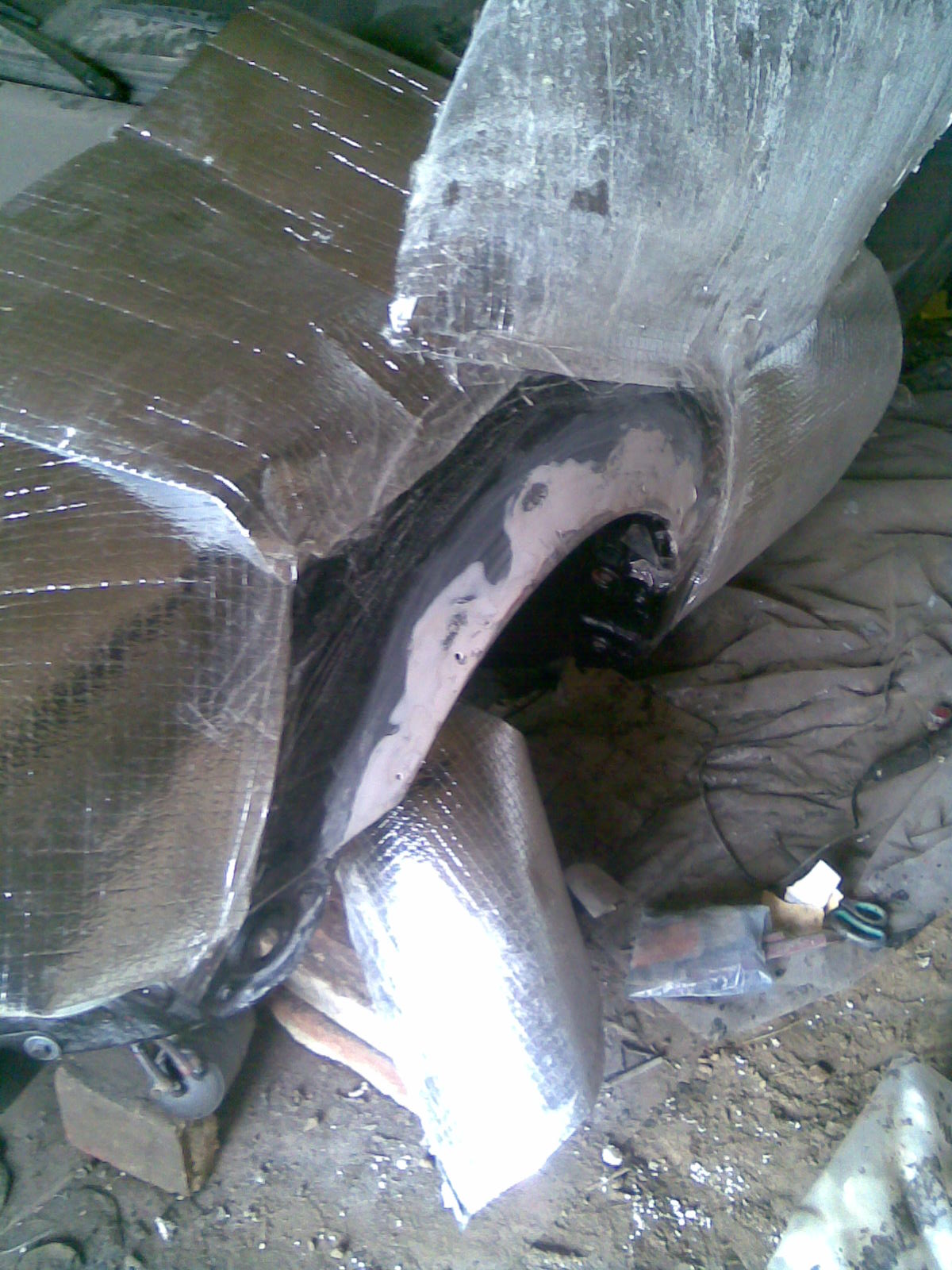 Pak se smontovali se spoilery a nasadilo se to na auto jeste chybí levý bok, tam se čeká na novej lak zatím je to vzitý kitem a plničem a vzádu se strhla ta né pro toto auto zadní krytka DIMMA.A trochu na odech se vyčistli speedline.