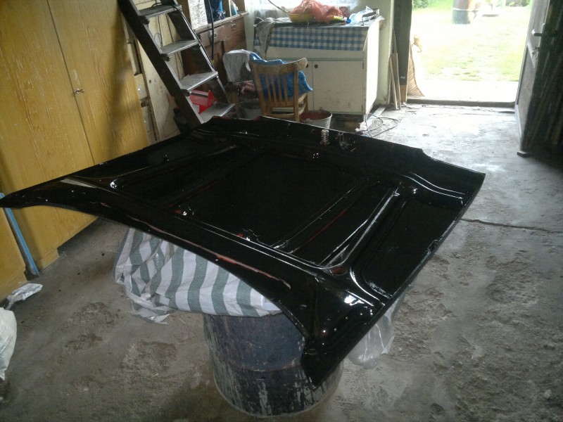 A zas o krok vpřed. Dnes proběhl ochranný nástřik prahů a předních podběhů. A taky jsem se nemohl dívat na tu červenou kapotu, tak jsem ji trochu přejel černou barvou.