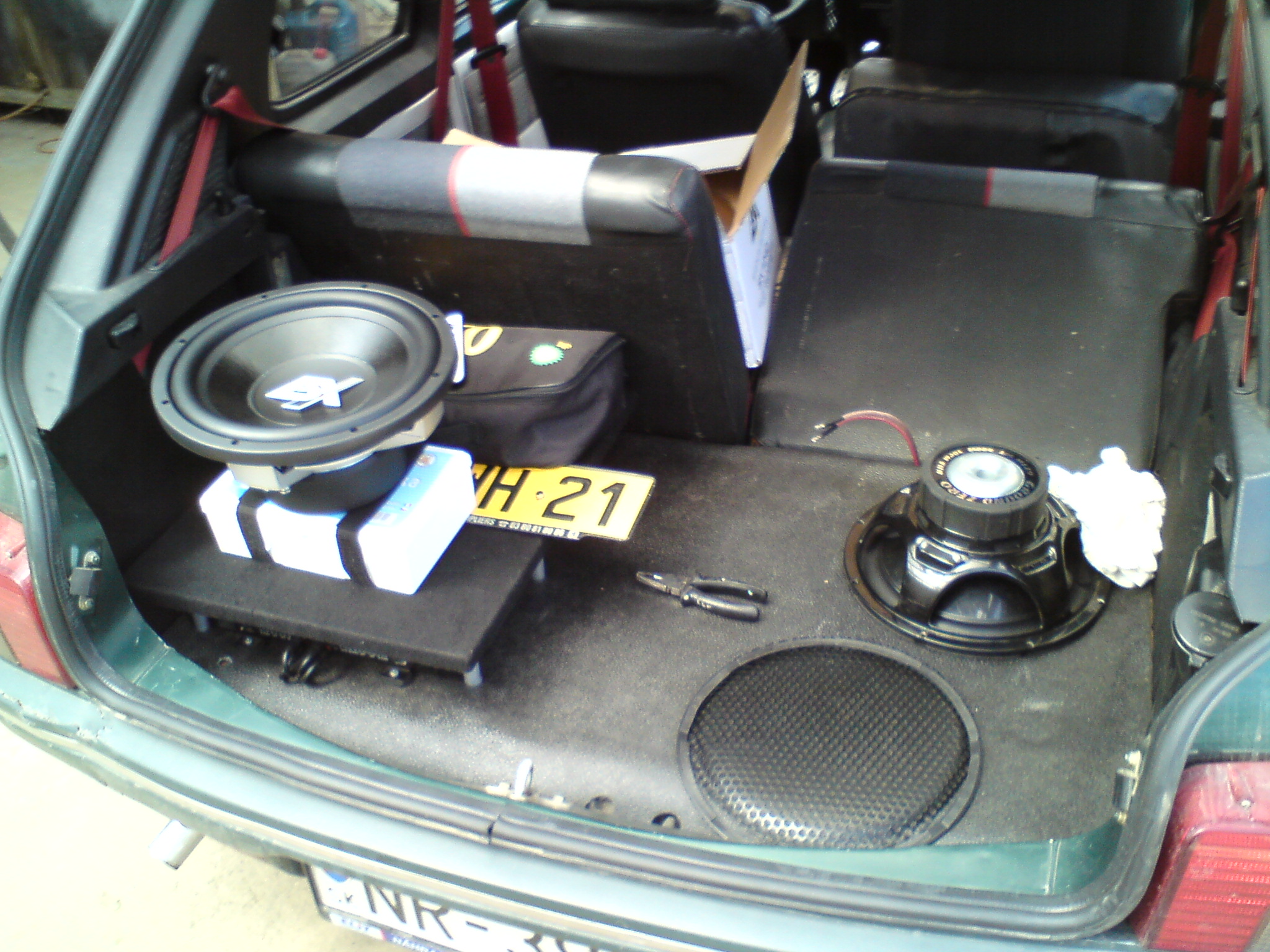 dnes som toho zase povystrajal...nahodil som lepsie radio a kedze sa my podarilo odpalit subwoofer tak som bol nuteny zaobstarat nahradnika. troska som sa pohral s maskou a kolesa som na skusku zatial strekol zlatym sprejom.