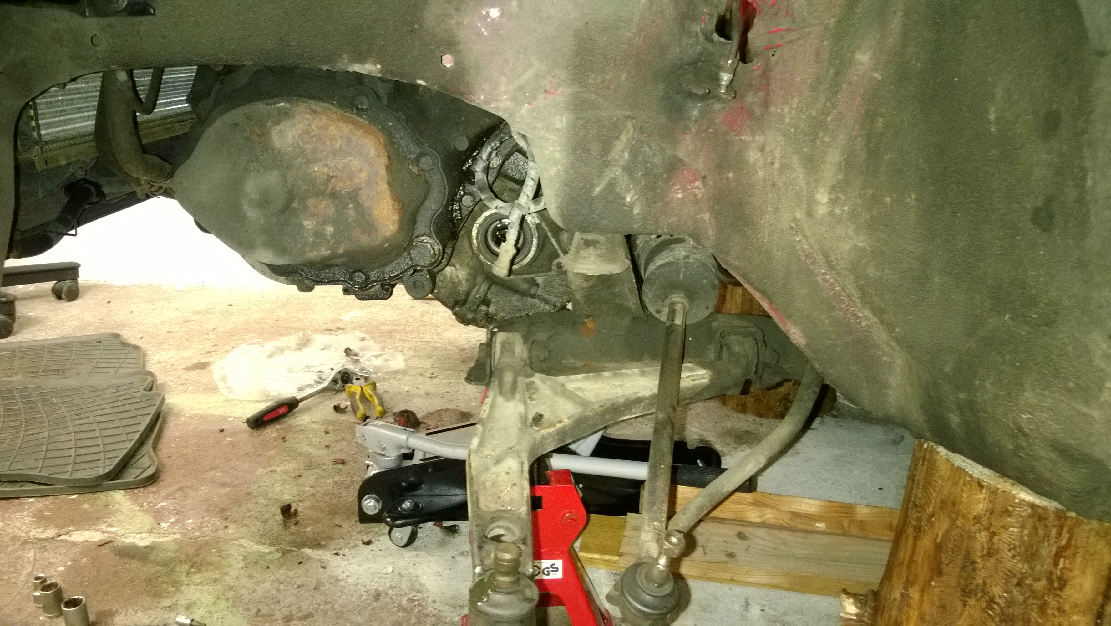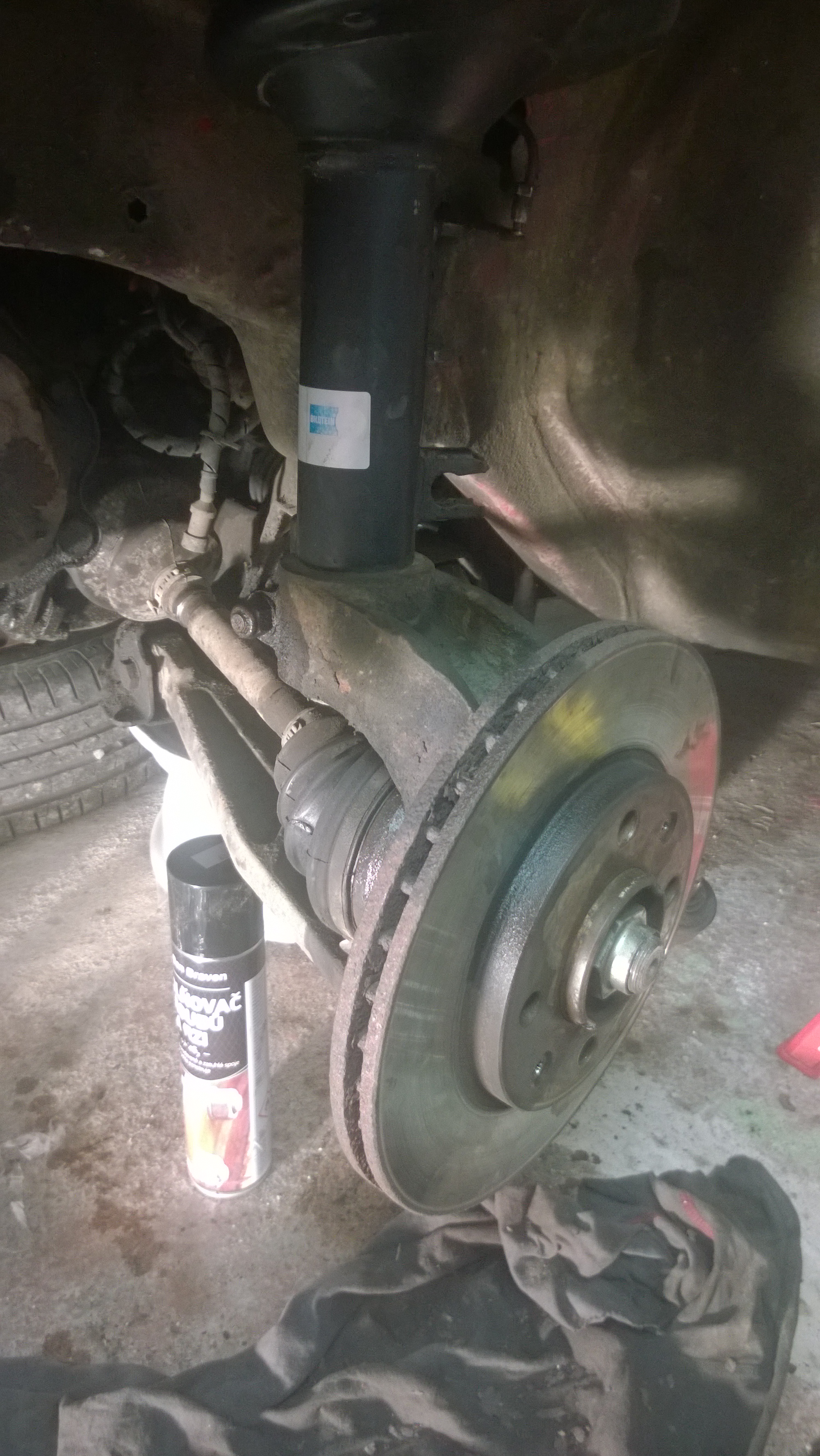 Zdeňku, kéž by ! Zatím je situace takové, jako na foto. Na druhé straně u psolujezdce je to podobné. V neděli jsem dělal spíš jen podpůrné práce - čistil nářadí od oleje, uklízel v garáži všechen ten bordel a rez, rozebíral těhlice, čistil a připravoval na písek a zinek. Btw. jaký je další postup ? Předpokládám, že teď bych měl odpojit řízení a vypustit olej z posilovače, že ? Odkud se to řízení odpojuje - z vrchu přes motor nebo zespodu ?