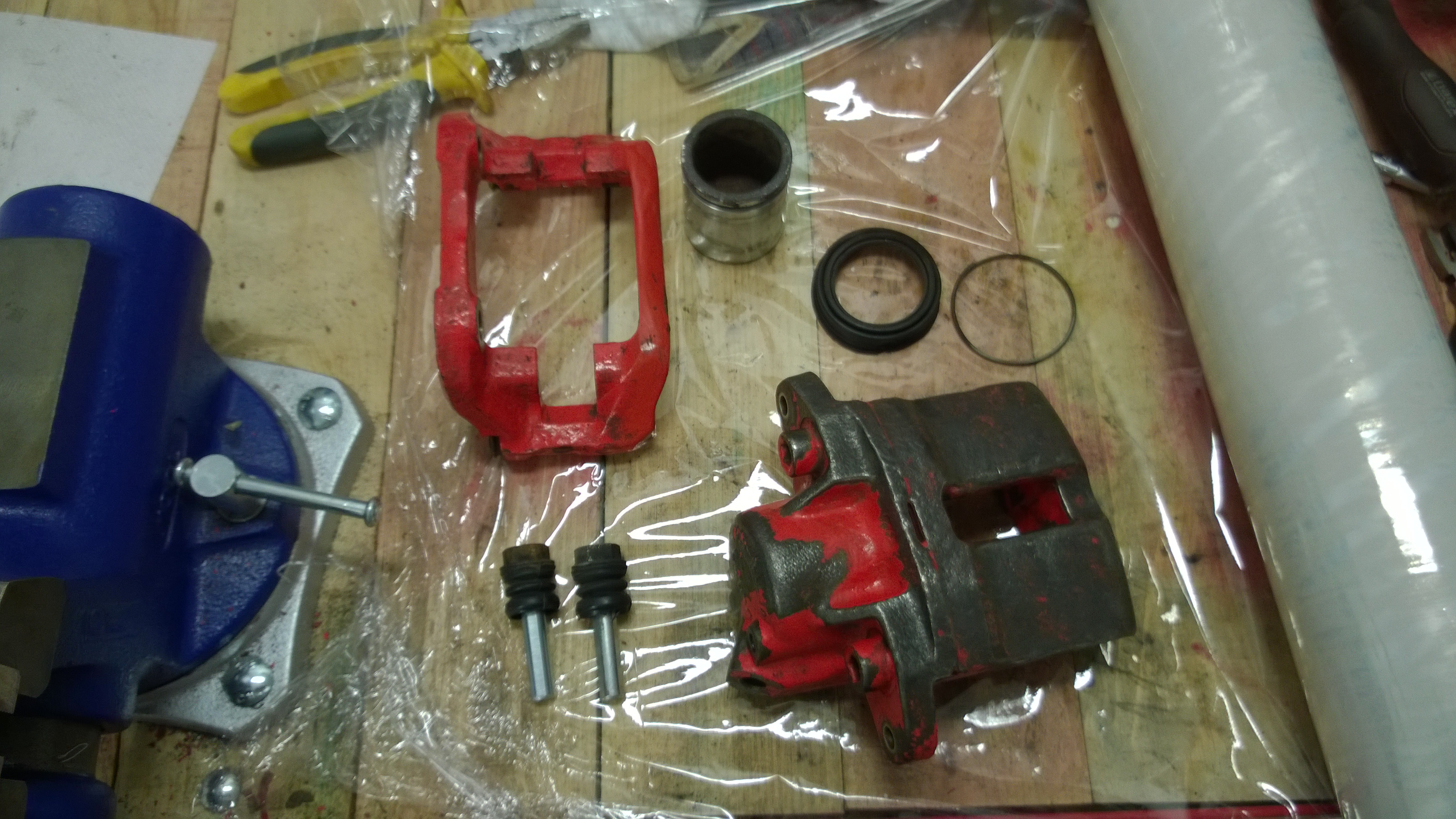 Repase přední nápravy v plném proudu. Třmeny sundány a odeslány Zdeňkovi na kompletní servis (písek, repas sada, převrtání odvzdušňováků). Zteřelé brzdové hadice sundány, kosti odmontovány, čepy ramen vyklepnuty z těhlic. Další krok je vypuštění oleje z převodovky, sundání poloos a tlumičů. Nakonec půjde dolů celá náprava, poté komplet písek, zinek, barva. Snad letošní sezónu ještě stihnem.