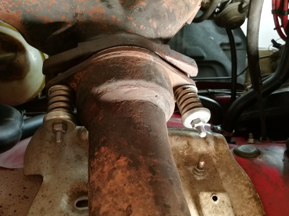 Abych se přiznal, tak vůbec netuším, jsou to původní pružiny, co tam dával Hroche. Můžu je změřit, ať vím, o kolik jsou snížené. Teda v případě že někdo víte, kolik je standardní délka. Každopádně stahováky na ně potřeba nejsou, to je pravda. Sedne to přesně, po dotažení horní matice na tlumiči se pružina ani nehne, ale taky není ani trochu stlačená.
