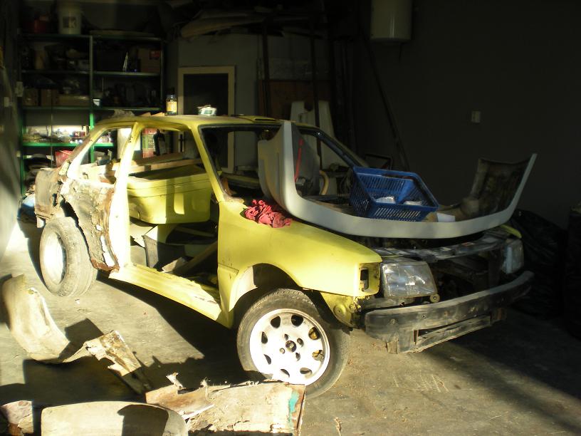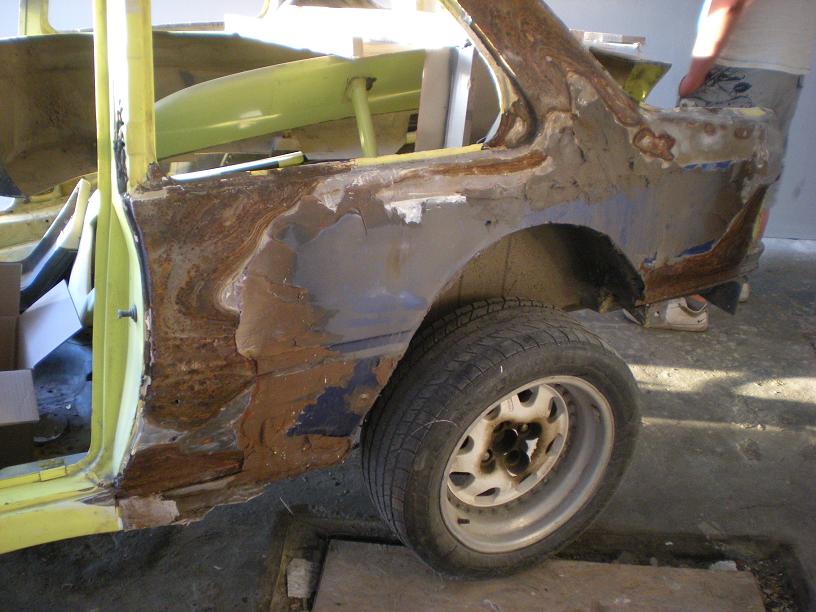 tak zatim máme odstrojený zadek.Co tam vylezlo na nás posuďte sami.Jen mě těší,že tam jsou originál štítky od Dimmy.Všude jsou tuny kitu,montážní pěny a novin.Naštěstí jsou hotový kopita a už vše bude jak má být.Návíc projde odlehčovací kůrou-vyříznou se zadní blatníky a pak se kastle vyztuží...
