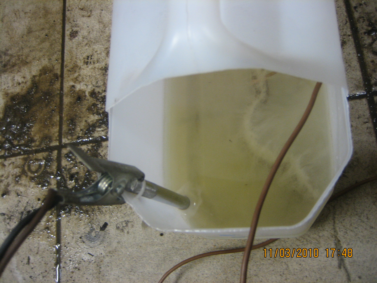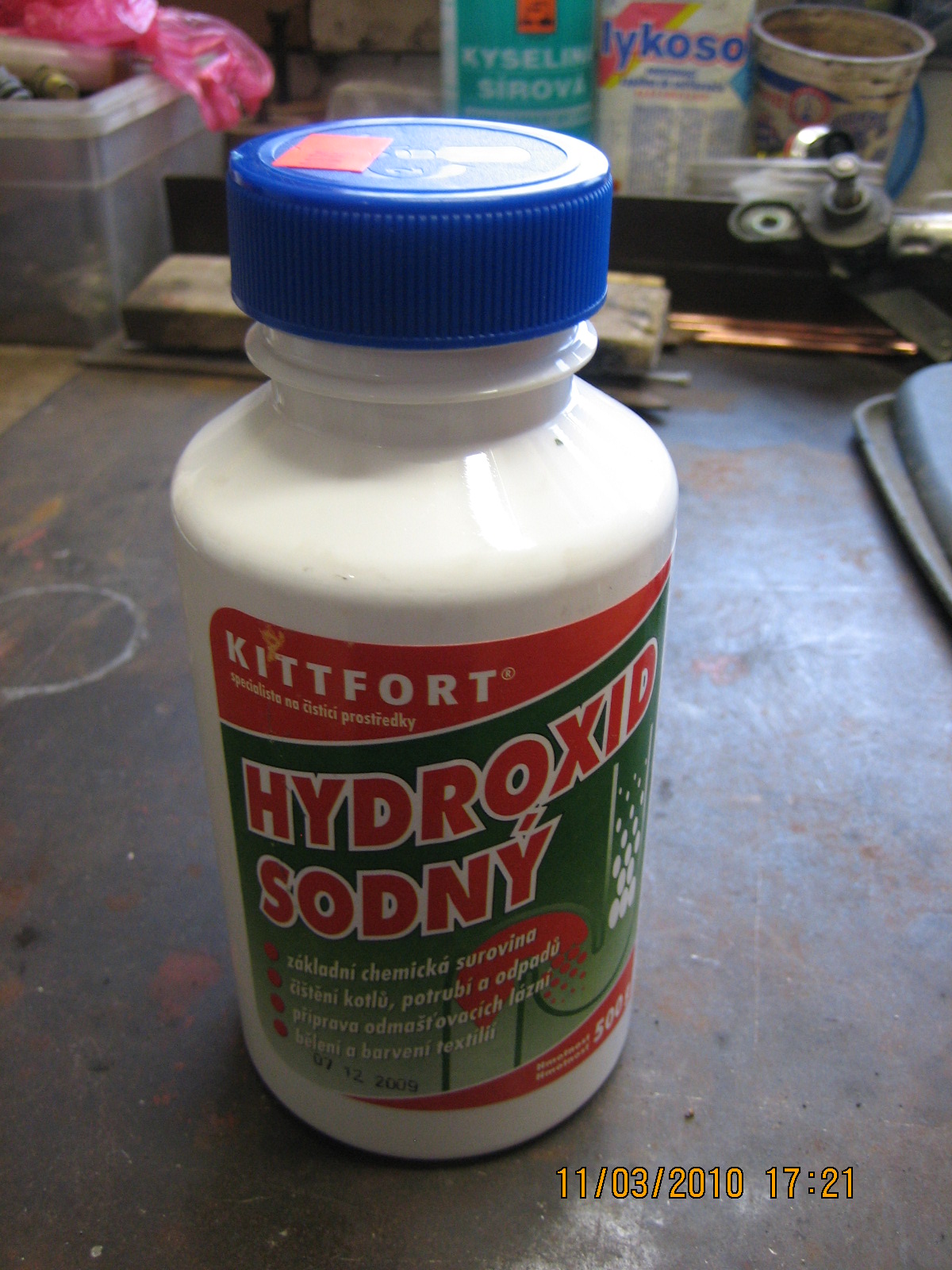 Nebudu se tady tedy nějak moc rozepisovat a půjdu rovnou na věc.Takže jsem zalezl do mé chemické dílny zvané garáž a pustil se do pokusu.Koupil jsem si hydroxid sodný v granulkách,který jsem přidával dle potřeby....vyříznul jsem si pěkně kanystřík od nemrzky a připevnil profesionálně nerez tyčku co jsem schrastil :up: