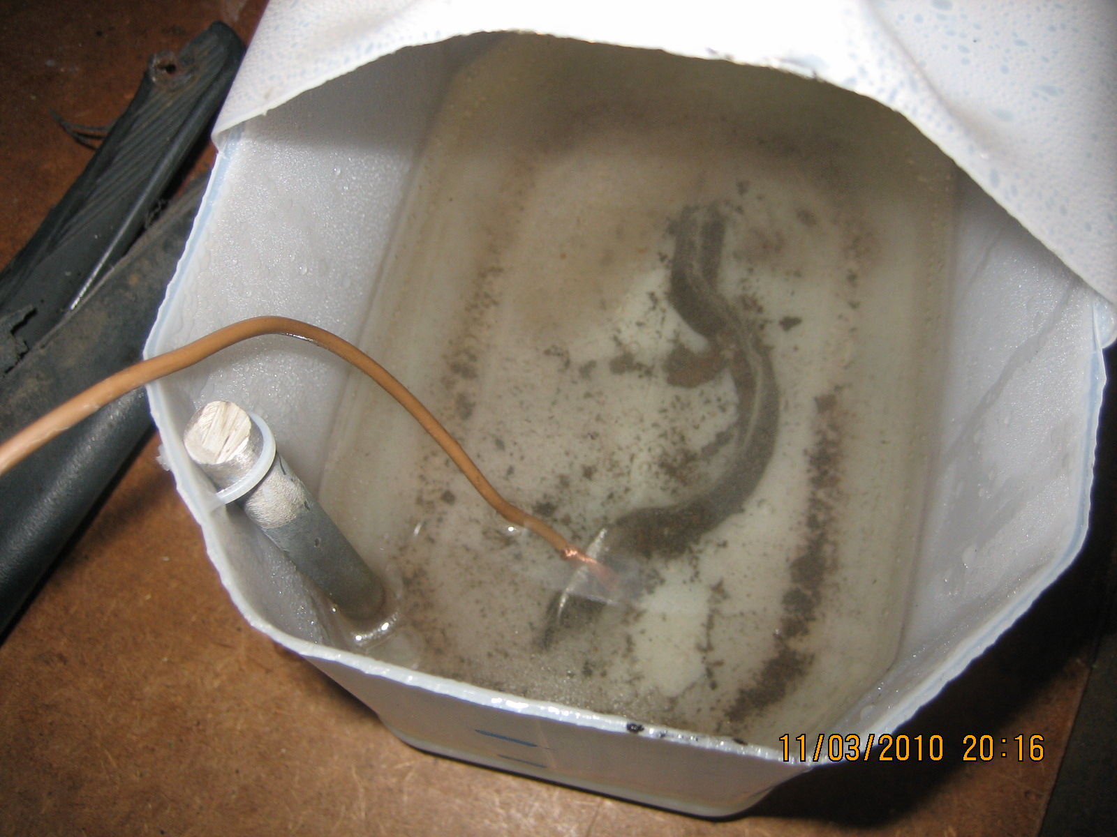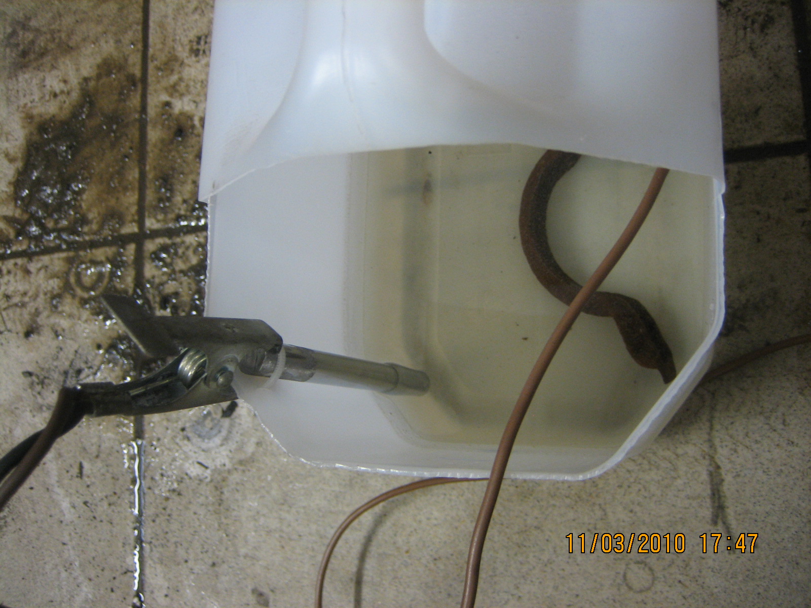 Potom to chtělo vodu a do ní granulky a pěkně promíchat(líp se rozpouští v teplé vodě)Pak jsem připojil na tyčku plus pol od nabíječky a minus na čištěnou věc.Pustil sem do toho ampéry a už to začlo pracovat ;-)