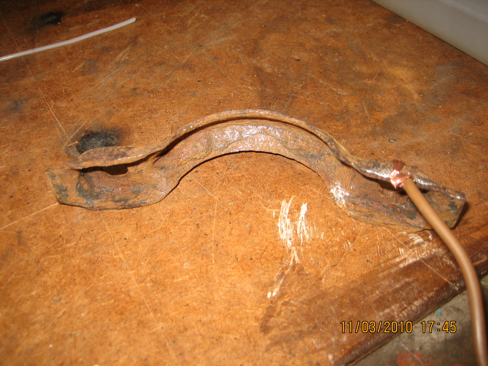 Jak už jste viděli,tak jsem použil sponu z výfuku a byla fakt dost jetá.Po skončení se na ní udělal černý povlak,tak jsem vzdychnul zklamáním,ale stačilo lehce kartáčem očistit,možná i omýt a hned se objevil pěkný kov,takže myslím že úspěch tam bude.